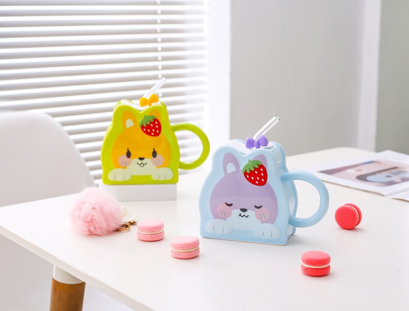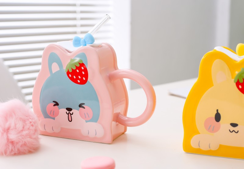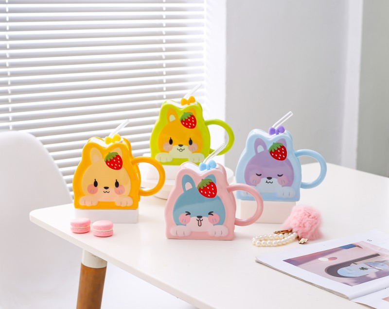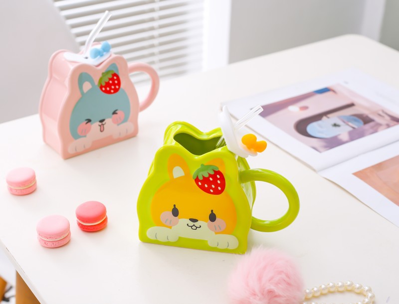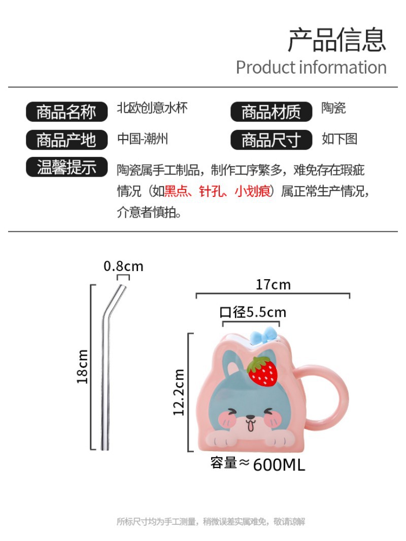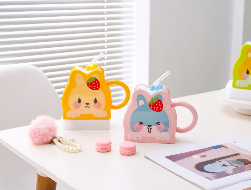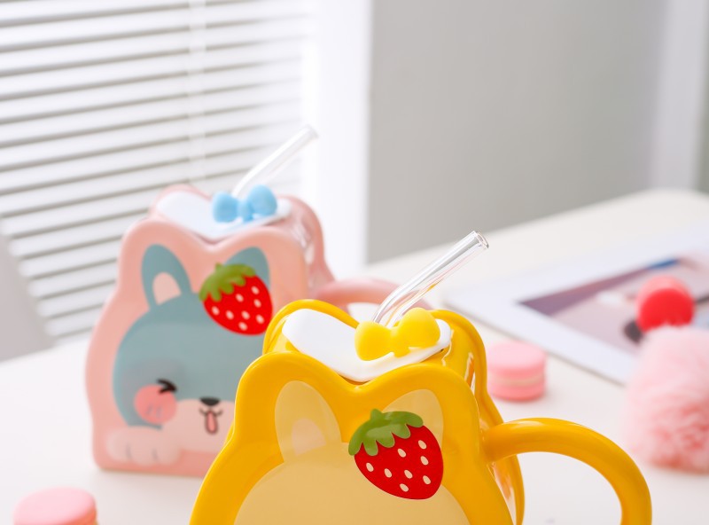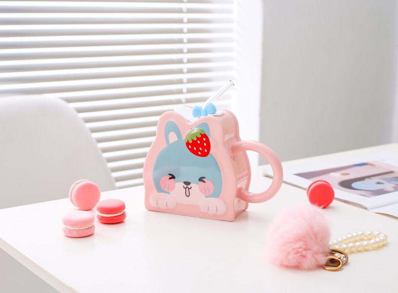 Taza de paja de cerámica creativa de dibujos animados lindo conejo taza Rosa chica corazón gran capacidad pareja taza de agua