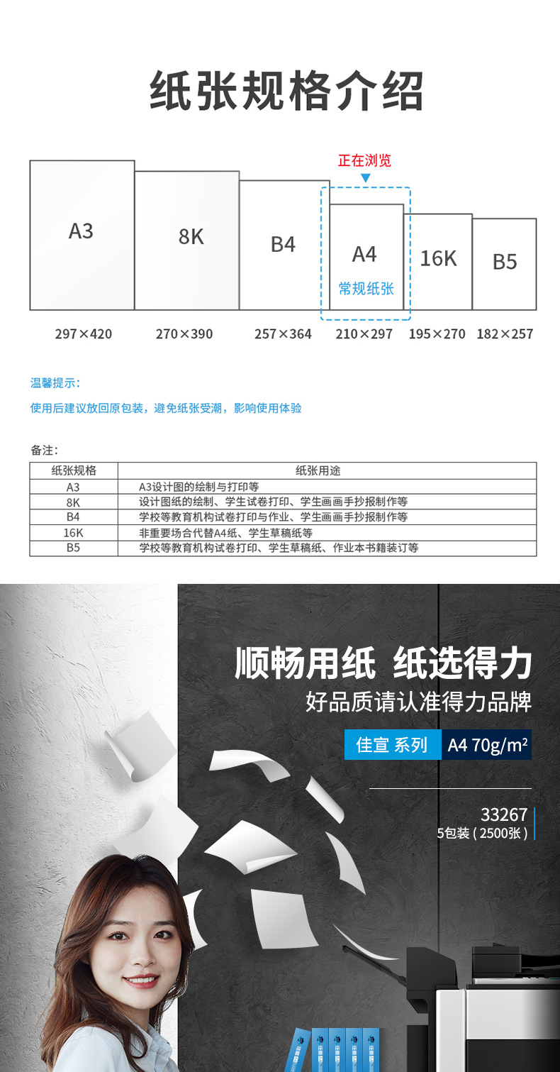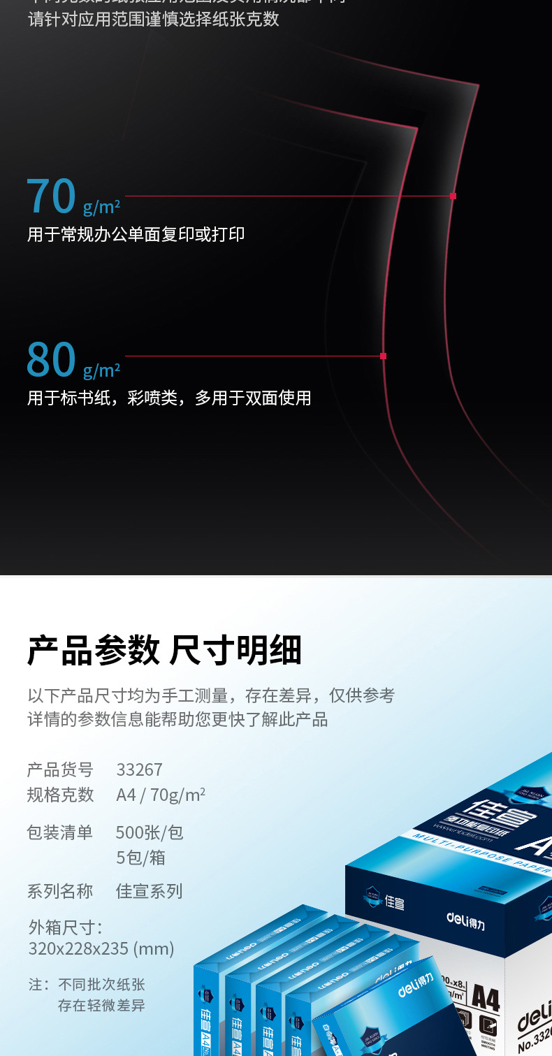 | Color | A4-得力系列随机-70G-1包-500张,A4-得力系列随机-70G-5包-2500张,A4-得力系列随机-80G-1包-500张,A4-得力系列随机-80G-5包-2500张,A4-随机品牌-70G-1包-500张,A4-随机品牌-70G-5包-2500张,A4-随机品牌-80G-1包-500张,A4-随机品牌-80G-5包-2500张,A4-佳宣-70G-1包-500张,A4-佳宣-70G-5包-2500张,A4-佳宣-80G-1包-500张,A4-佳宣-80G-5包-2500张,A4-佳铂-70G-1包-500张,A4-佳铂-70G-5包-2500张,A4-佳铂-80G-1包-500张,A4-佳铂-80G-5包-2500张,A4-塞纳河-70G-1包-500张,A4-塞纳河-70G-5包-2500张,A4-珊瑚海-70G-1包-500张,A4-珊瑚海-70G-5包-2500张,A4-珊瑚海-80G-1包-500张,A4-珊瑚海-80G-5包-2500张,A4-木尚-70G-1包-500张,A4-木尚-70G-5包-2500张,A4-木尚-80G-1包-500张,A4-木尚-80G-5包-2500张,A4-铭锐-70G-1包-500张,A4-铭锐-70G-5包-2500张,A4-铭锐-80G-1包-500张,A4-铭锐-80G-5包-2500张,A4-绿柏-70G-1包-500张,A4-绿柏-70G-5包-2500张,A4-莱茵河-70G-1包-500张,A4-莱茵河-70G-5包-2500张,A4-莱茵河-80G-1包-500张,A4-莱茵河-80G-5包-2500张,A4-凯锐-70G-1包-500张,A4-凯锐-70G-5包-2500张,A4-金佳铂-70G-1包-500张,A4-金佳铂-70G-5包-2500张,A4-金佳铂-80G-1包-500张,A4-金佳铂-80G-5包-2500张,A4-得力护眼-75G-1包-500张,A4-得力护眼-75G-5包-2500张,A4-得力护眼体验装-75G-1包-100张,A4-帛尚-70G-1包-500张,A4-帛尚-70G-5包-2500张,A4-白令海-70G-1包-500张,A4-白令海-70G-5包-2500张,A4-白令海-80G-1包-500张,A4-白令海-80G-5包-2500张,A4-得力体验装-70G-1包-100张,A4-得力体验装-70G-100张-2包,A4-得力体验装-70G-100张-3包 |