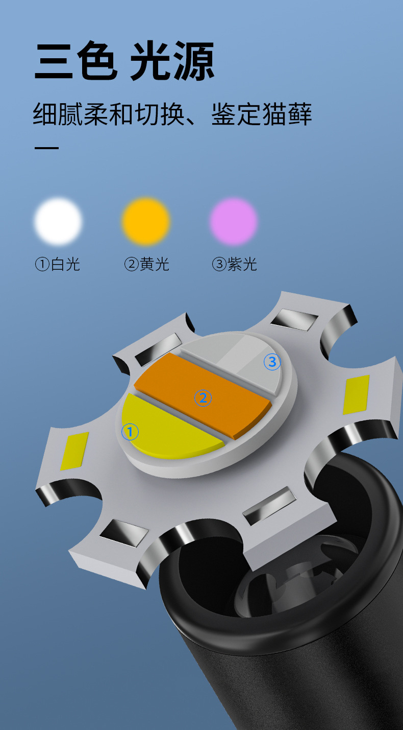Fuente de luz transfronteriza tricolor Wood Pen Lámpara de pupila de luz blanco amarillo violeta mini linterna de identificación de tinea felina