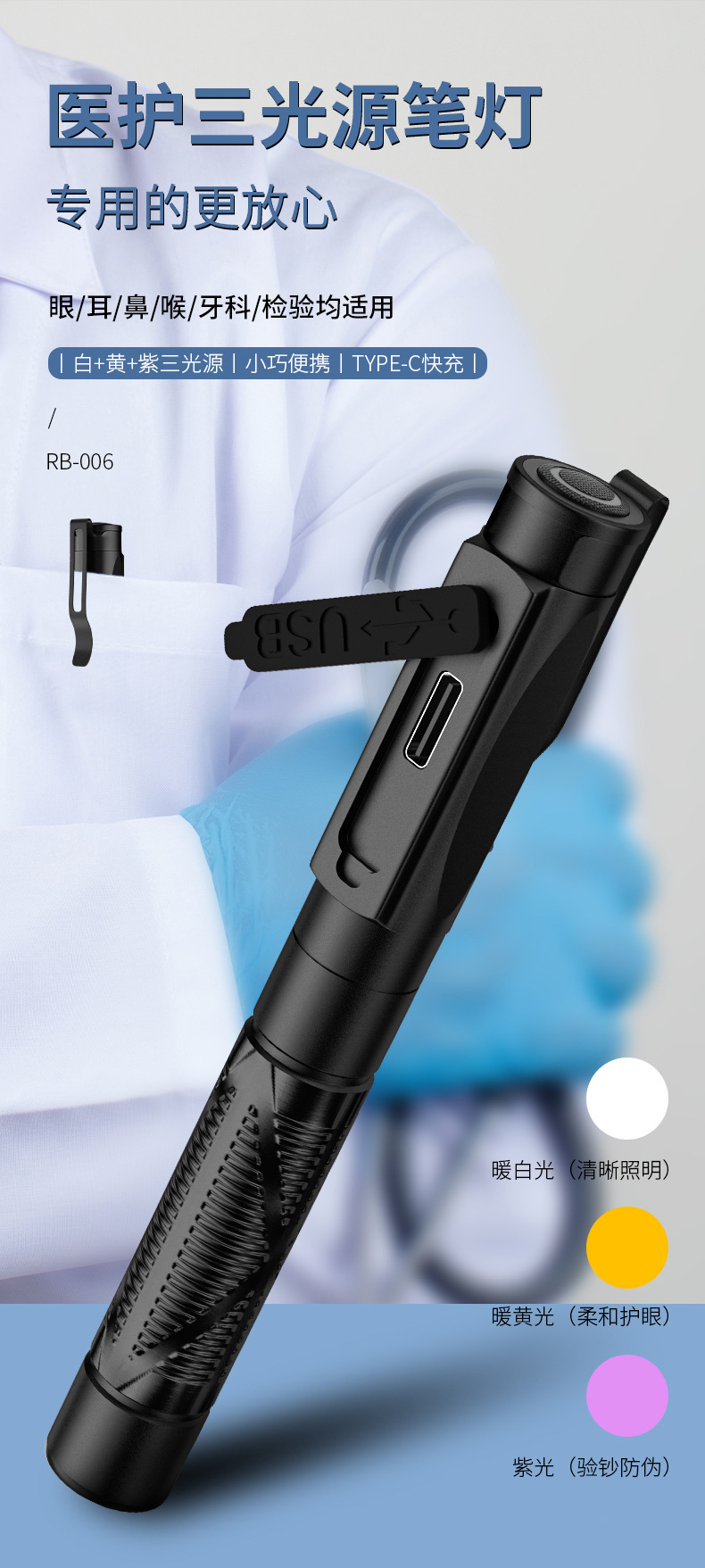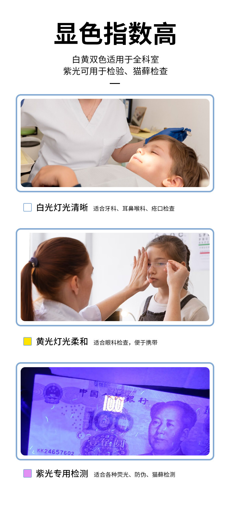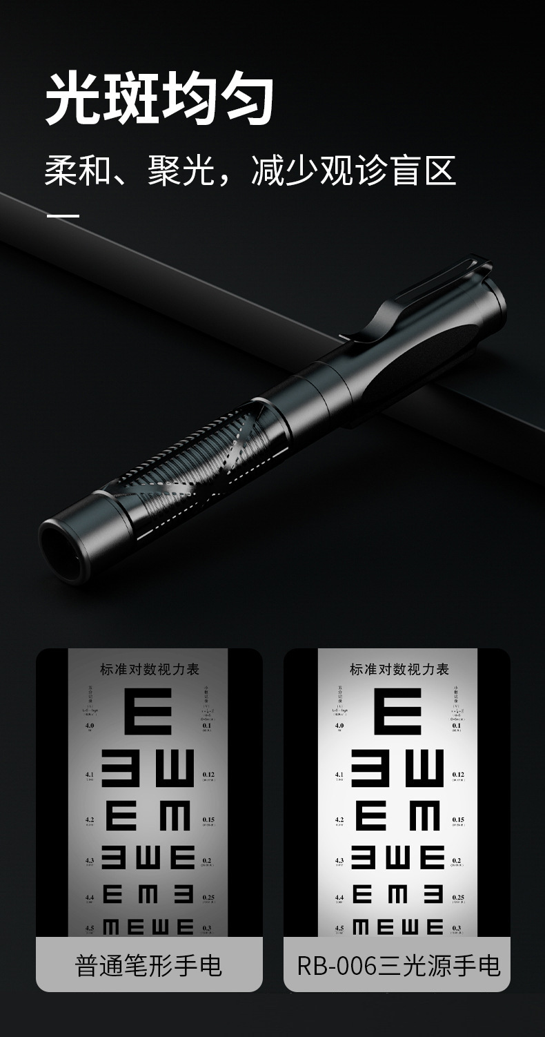 RB-006 lámpara de pupila médica amarillo blanco púrpura tres fuentes de luz modelo negro