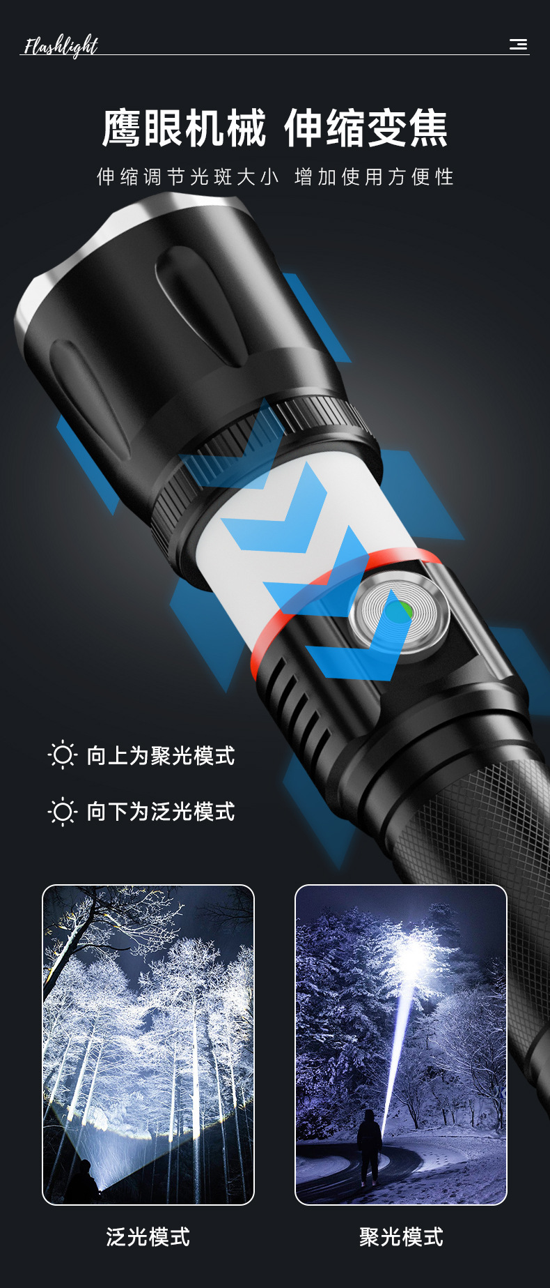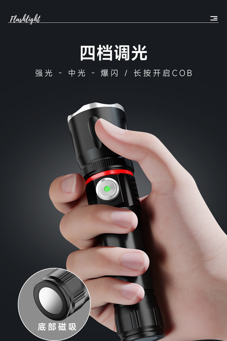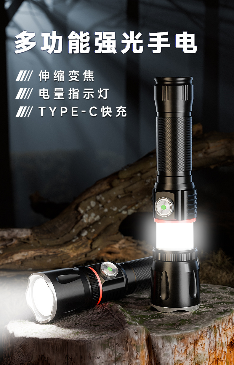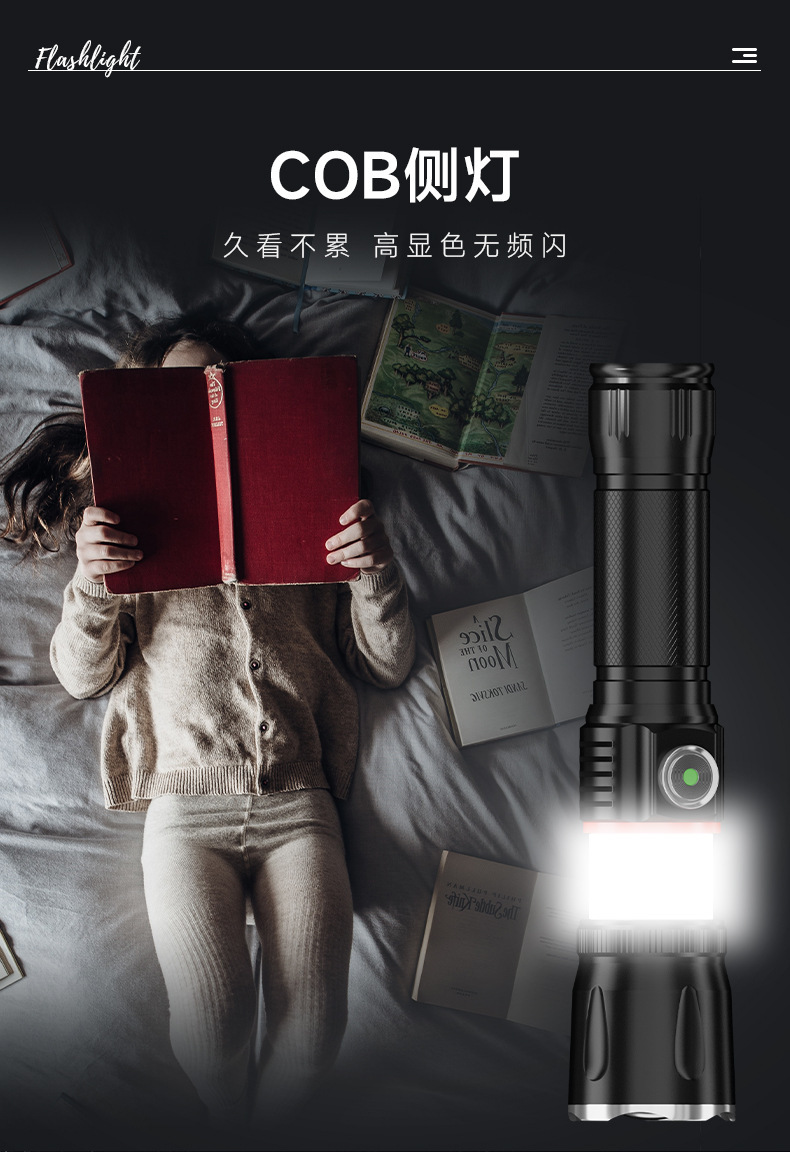 Linterna LED de luz fuerte de fuente de luz dual transfronteriza, carga USB de aleación de aluminio, iluminación exterior multifuncional, linterna portátil
