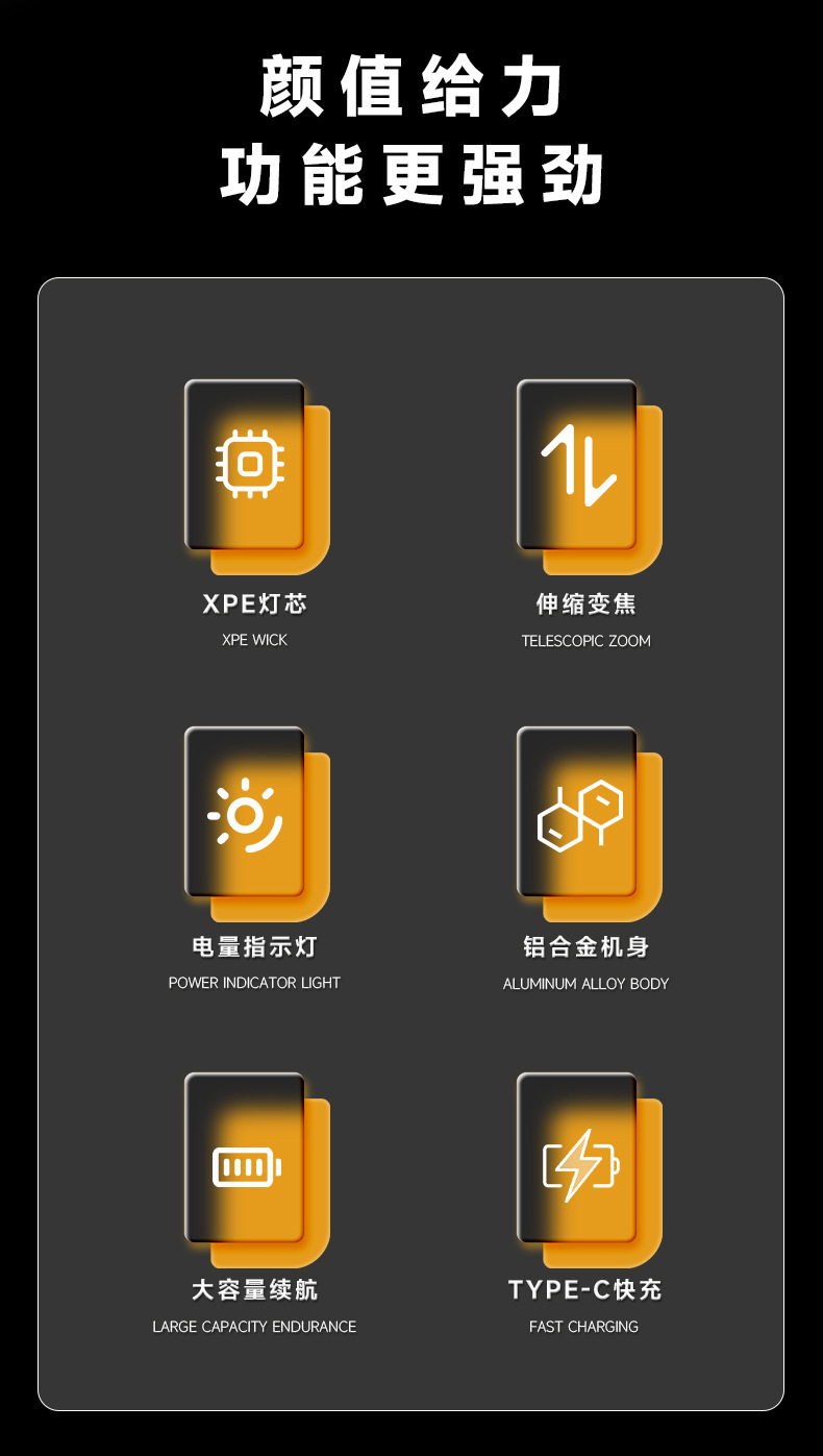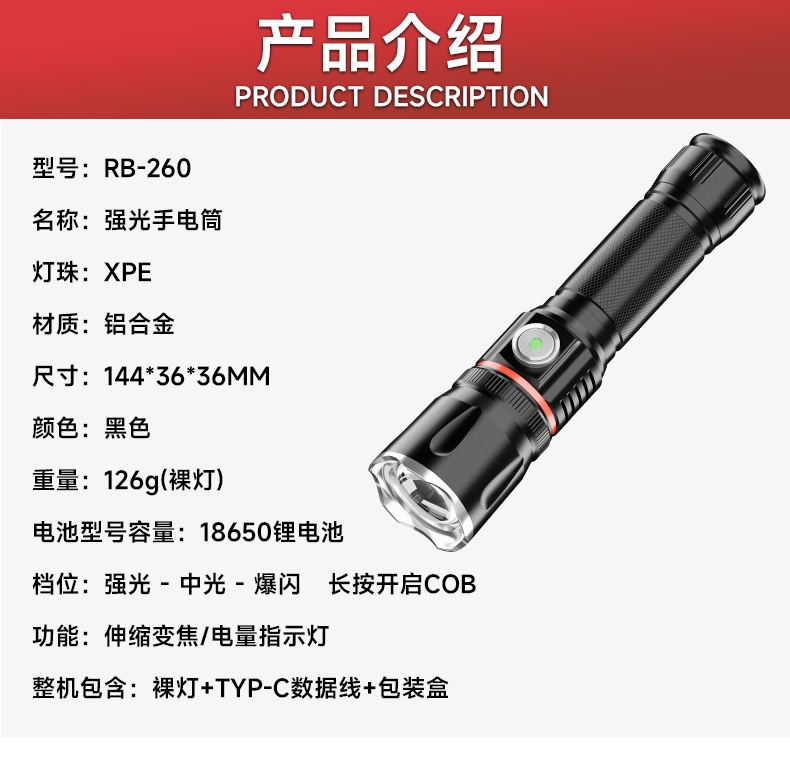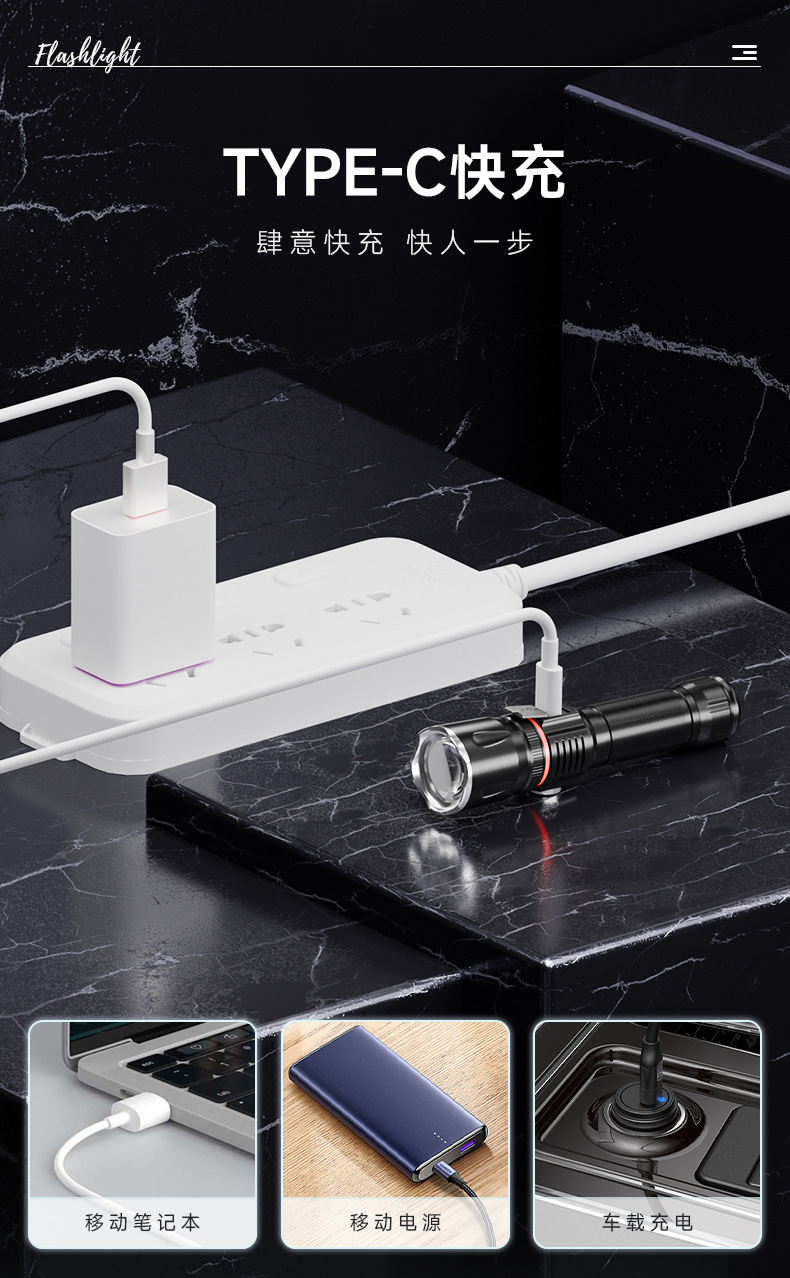 Linterna FF-260 estándar (lámpara desnuda 18650 caja de embalaje de cable de datos de TYPE-C de batería de litio)