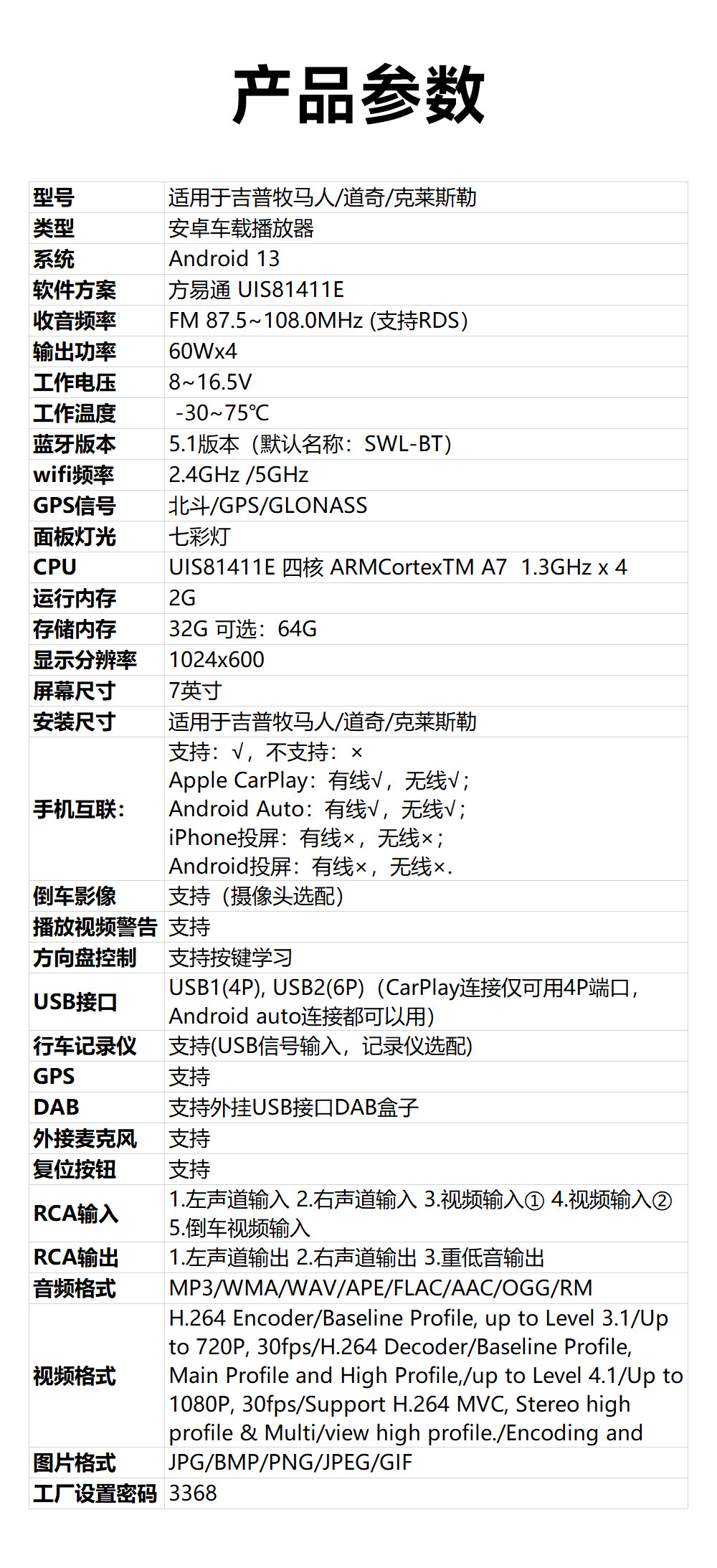Para Jeep Wrangler / Dodge / Chrysler de 7 pulgadas