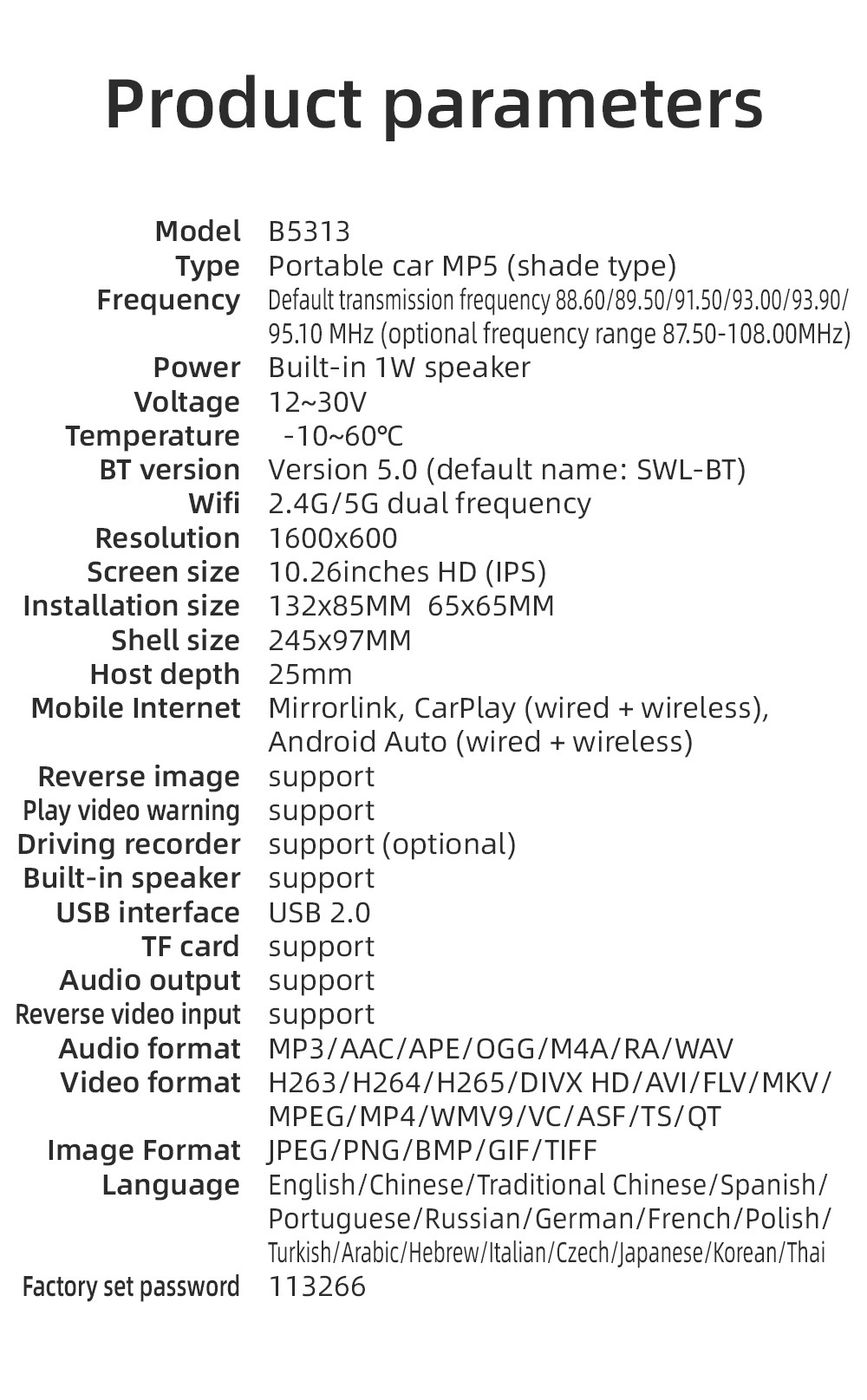 B5313 viene de serie con función inalámbrica carplay AHD (sin cámara)
