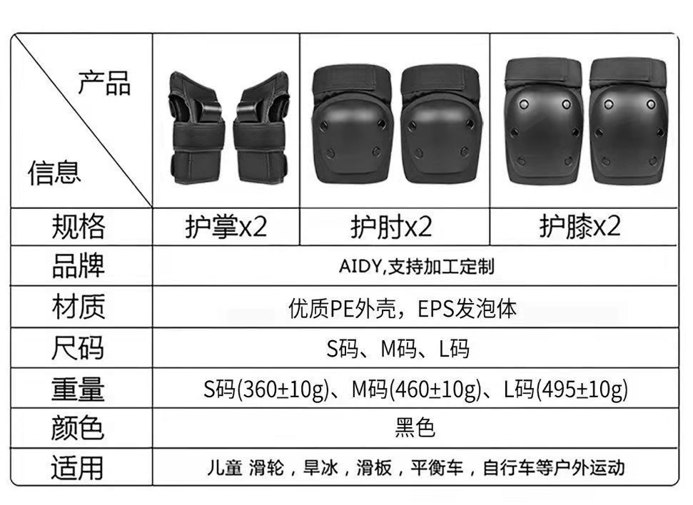 | Color | 黑色 护手掌一对-S码体重(20-60斤),黑色六件套(护膝 护肘 护手各一对)-S码体重(20-60斤),黑色六件套(护膝 护肘 护手各一对)-M码体重(70-110斤),黑色六件套(护膝 护肘 护手各一对)-L码体重(115-155斤),黑色六件套(护膝 护肘 护手各一对)-XL号体重(160-190斤),黑色七件套(头盔+护膝护肘护腕)-S码体重(20-60斤),黑色七件套(头盔+护膝护肘护腕)-M码体重(70-110斤),黑色七件套(头盔+护膝护肘护腕)-L码体重(115-155斤),黑色七件套(头盔+护膝护肘护腕)-XL号体重(160-190斤),白色六件套(护膝 护肘 护手各一对)-S码体重(20-60斤),白色六件套(护膝 护肘 护手各一对)-M码体重(70-110斤),白色六件套(护膝 护肘 护手各一对)-L码体重(115-155斤),白色六件套(护膝 护肘 护手各一对)-XL号体重(160-190斤),白色七件套(头盔+护膝护肘护腕)-S码体重(20-60斤),白色七件套(头盔+护膝护肘护腕)-M码体重(70-110斤),白色七件套(头盔+护膝护肘护腕)-L码体重(115-155斤),白色七件套(头盔+护膝护肘护腕)-XL号体重(160-190斤),粉色六件套(护膝 护肘 护手各一对)-S码体重(20-60斤),粉色六件套(护膝 护肘 护手各一对)-M码体重(70-110斤),粉色六件套(护膝 护肘 护手各一对)-L码体重(115-155斤),粉色六件套(护膝 护肘 护手各一对)-XL号体重(160-190斤),粉色七件套(头盔+护膝护肘护腕)-S码体重(20-60斤),粉色七件套(头盔+护膝护肘护腕)-M码体重(70-110斤),粉色七件套(头盔+护膝护肘护腕)-L码体重(115-155斤),粉色七件套(头盔+护膝护肘护腕)-XL号体重(160-190斤),灰色六件套(护膝 护肘 护手各一对)-S码体重(20-60斤),灰色六件套(护膝 护肘 护手各一对)-M码体重(70-110斤),灰色六件套(护膝 护肘 护手各一对)-L码体重(115-155斤),灰色六件套(护膝 护肘 护手各一对)-XL号体重(160-190斤),灰色七件套(头盔+护膝护肘护腕)-S码体重(20-60斤),灰色七件套(头盔+护膝护肘护腕)-M码体重(70-110斤),灰色七件套(头盔+护膝护肘护腕)-L码体重(115-155斤),灰色七件套(头盔+护膝护肘护腕)-XL号体重(160-190斤),黑色 四件套(护膝+护肘各一对)-S码体重(20-60斤),黑色 四件套(护膝+护肘各一对)-M码体重(70-110斤),黑色 四件套(护膝+护肘各一对)-L码体重(115-155斤),黑色 四件套(护膝+护肘各一对)-XL号体重(160-190斤),黑色 四件套(护膝+护手各一对)-S码体重(20-60斤),黑色 四件套(护膝+护手各一对)-M码体重(70-110斤),黑色 四件套(护膝+护手各一对)-L码体重(115-155斤),黑色 四件套(护膝+护手各一对)-XL号体重(160-190斤),黑色 四件套(护肘+护手各一对)-S码体重(20-60斤),黑色 四件套(护肘+护手各一对)-M码体重(70-110斤),黑色 四件套(护肘+护手各一对)-L码体重(115-155斤),黑色 四件套(护肘+护手各一对)-XL号体重(160-190斤),黑色 护膝一对-S码体重(20-60斤),黑色 护膝一对-M码体重(70-110斤),黑色 护膝一对-L码体重(115-155斤),黑色 护膝一对-XL号体重(160-190斤),黑色 护肘一对-S码体重(20-60斤),黑色 护肘一对-M码体重(70-110斤),黑色 护肘一对-L码体重(115-155斤),黑色 护肘一对-XL号体重(160-190斤),黑色 护手掌一对-M码体重(70-110斤),黑色 护手掌一对-L码体重(115-155斤),黑色 护手掌一对-XL号体重(160-190斤) |