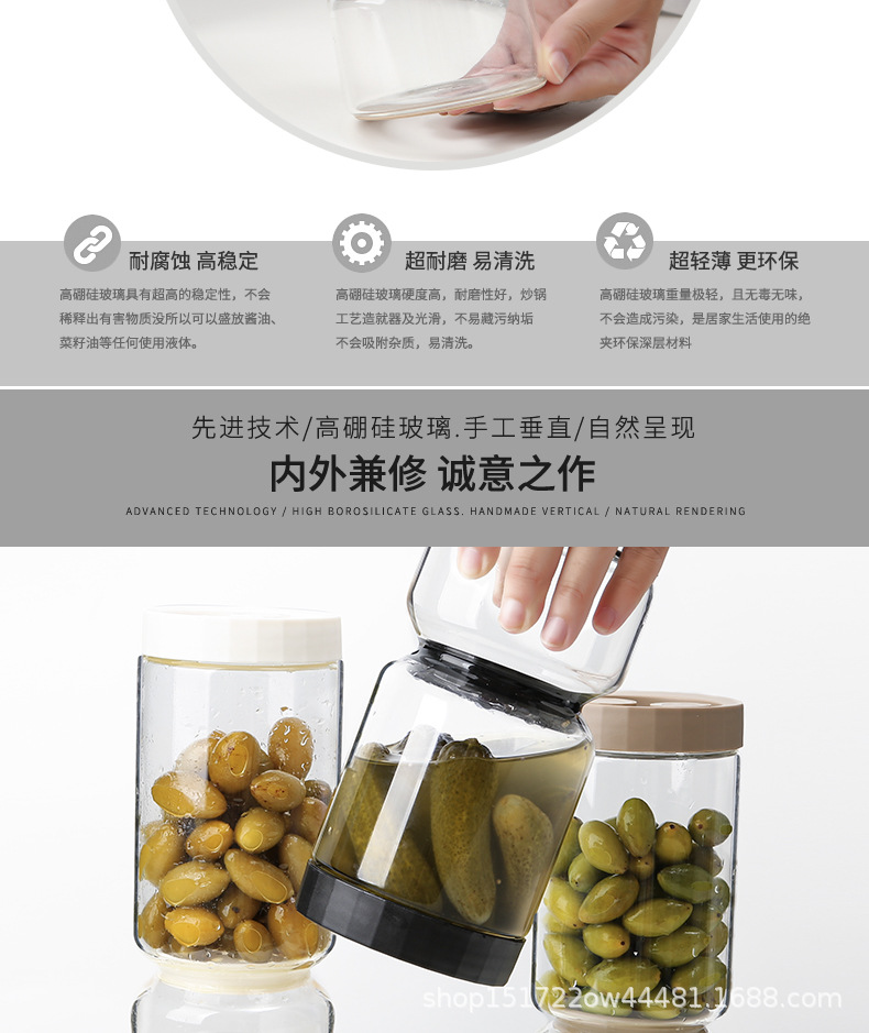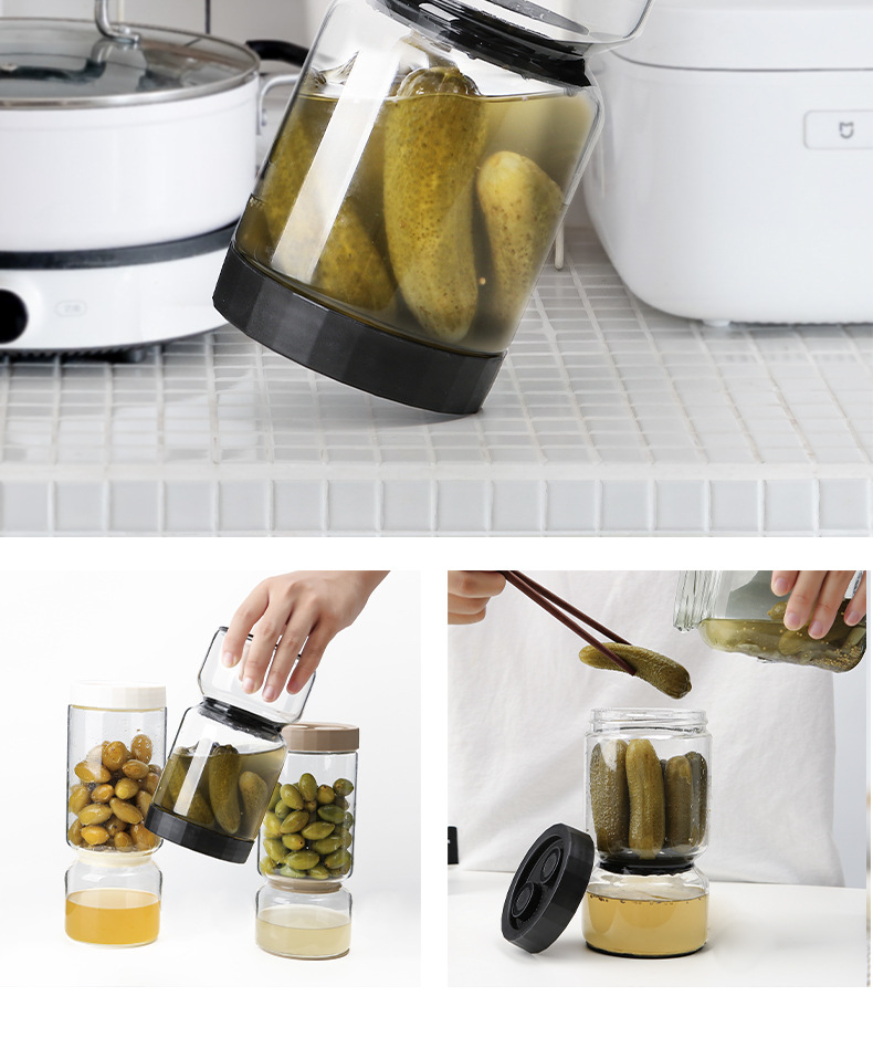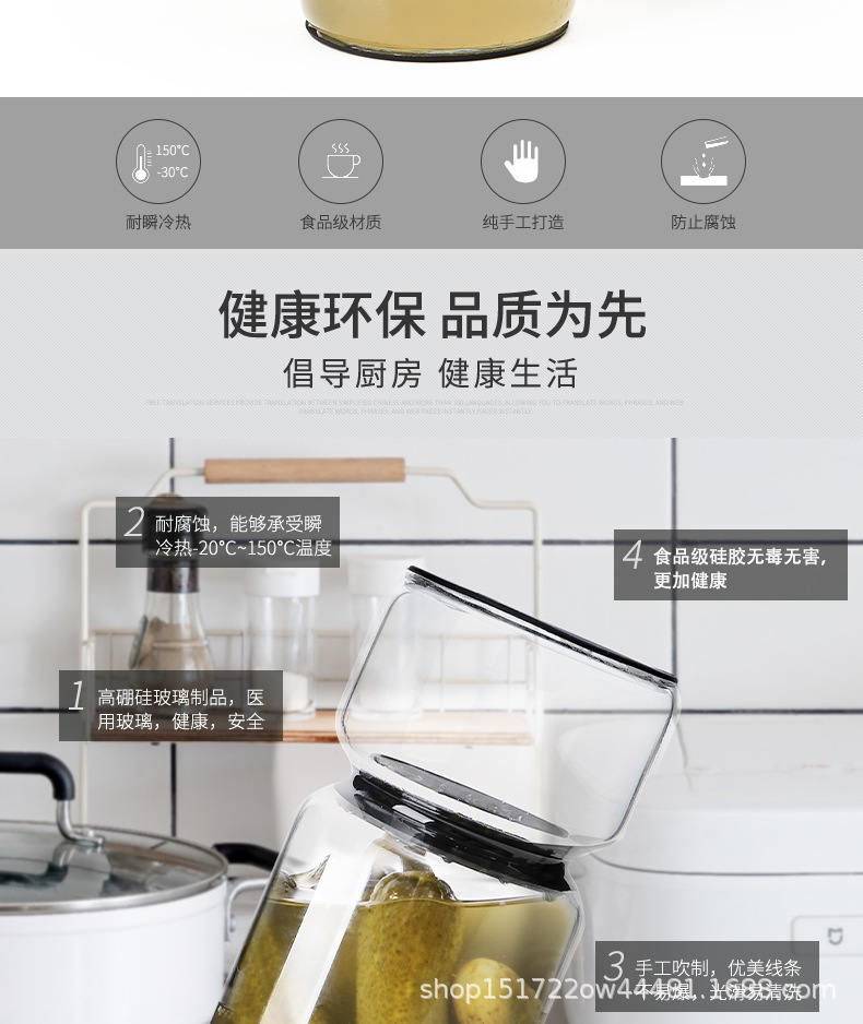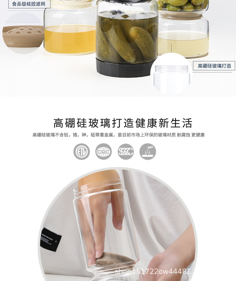 Pot de pepinado de vidrio de alto silicio de silicio con filtro, recipiente de pepinado con tapa a prueba de fugas, sello doméstico de latas de pepinado