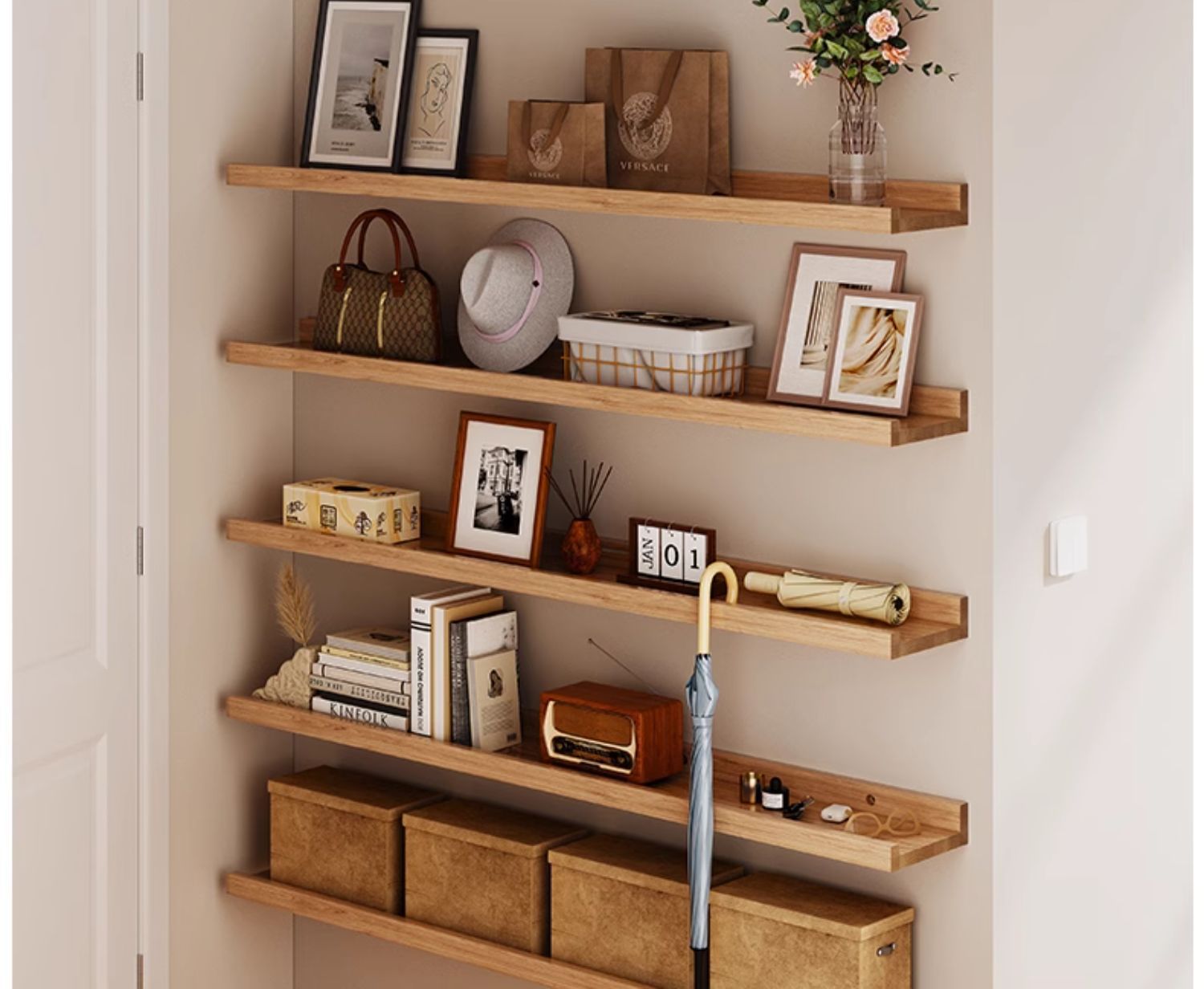 Estante de almacenamiento ultra delgado detrás de la puerta en la pared de madera sólida, espacio muy estrecho para almacenar estante de exhibición de madera de pino, estante libre de pintura
