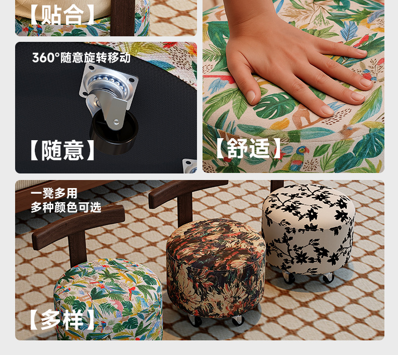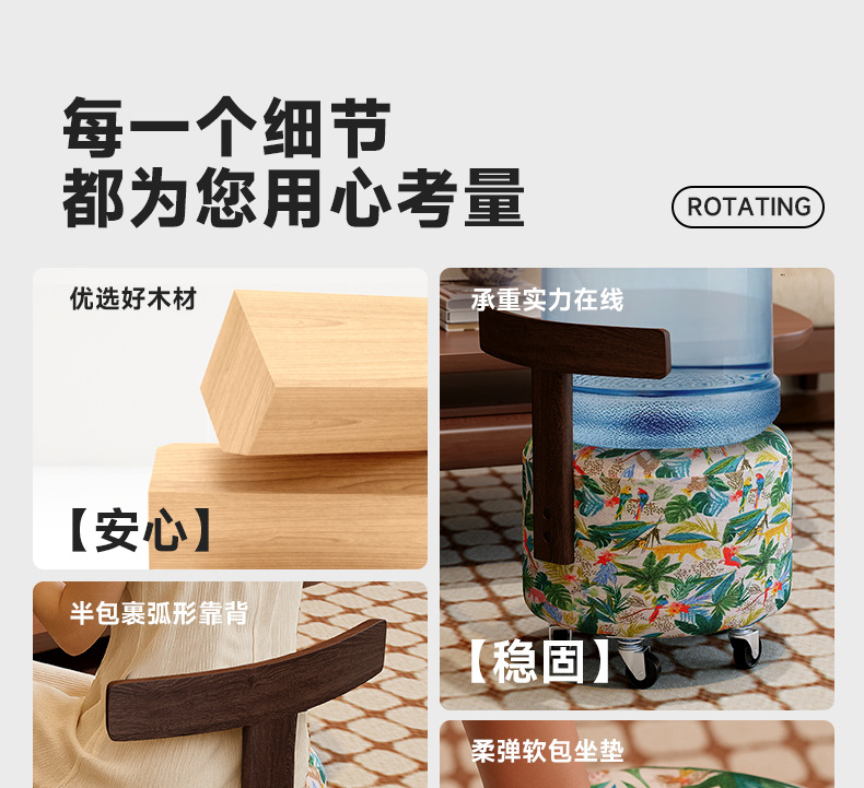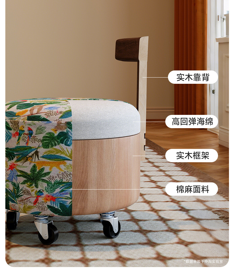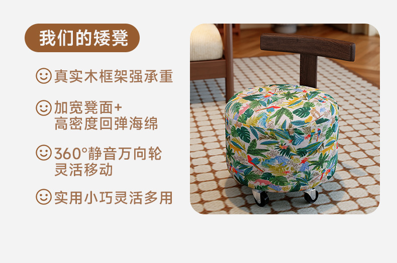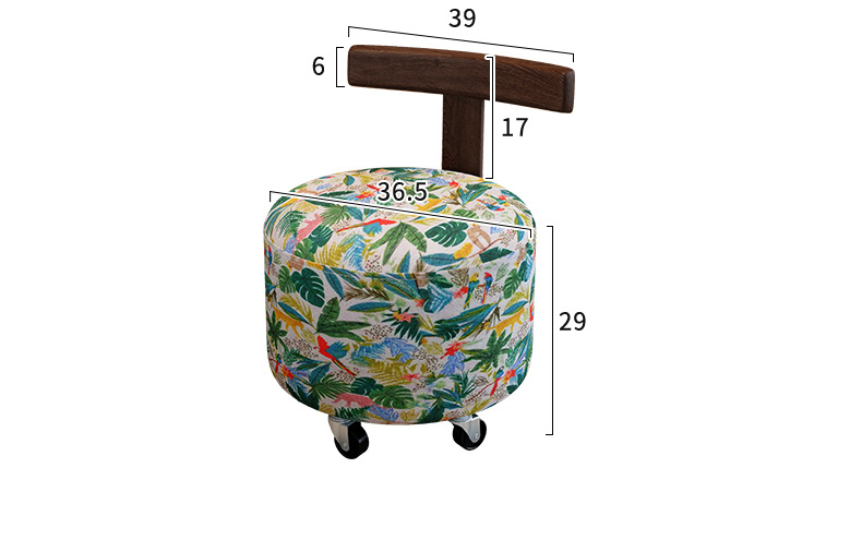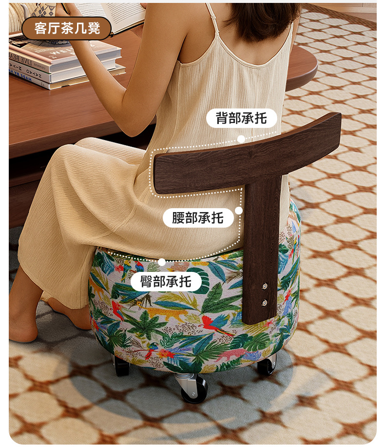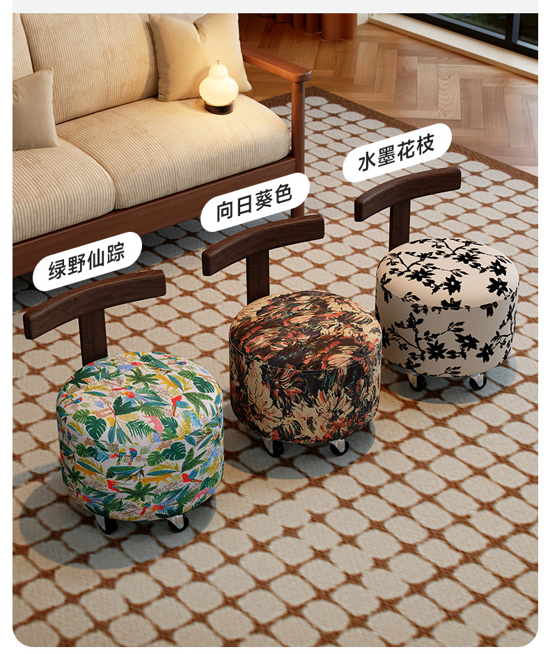 Taburete de rueda universal, silla de respaldo de madera sólida doméstica, taburete de salón, taburete retrógrado bajo, taburete de cambio de zapatos