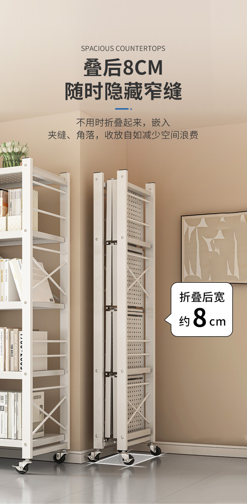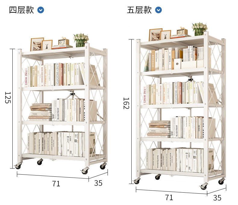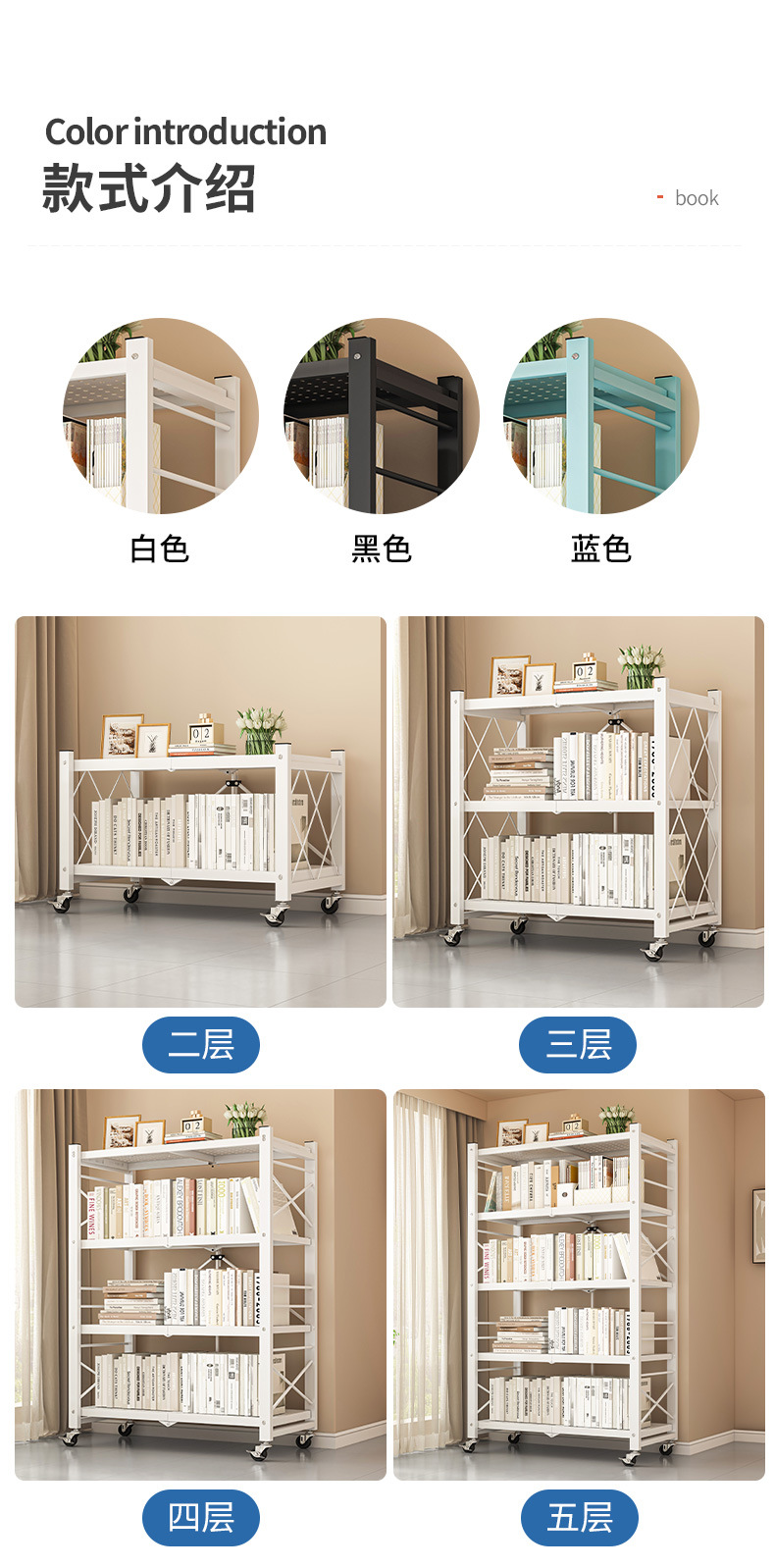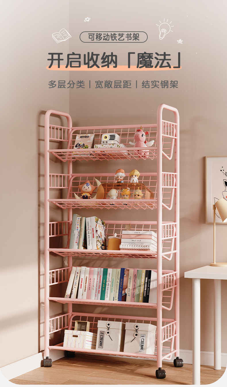 Estante de libros para niños Estante de almacenamiento de hierro forjado contra la pared Estante de almacenamiento de piso Estante de ruedas plegable móvil junto al escritorio