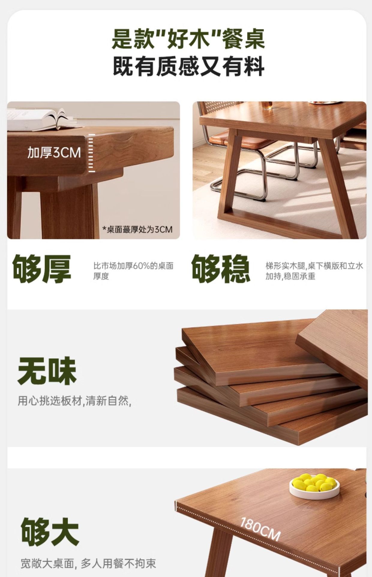 | Color | 性价比选15MM桌面100*60CM胡桃色,性价比选15MM桌面120*60CM胡桃色,性价比选15MM桌面140*60CM胡桃色,性价比选15MM桌面160*60CM胡桃色,主图款昇级加厚30MM桌面120*60CM胡桃色,主图款昇级加厚30MM桌面140*60CM胡桃色,主图款昇级加厚30MM桌面160*80CM胡桃色,主图款昇级加厚30MM桌面180*80CM胡桃色,昇级加厚款30MM桌面120*60CM原木色,昇级加厚款30MM桌面140*60CM原木色,昇级加厚款30MM桌面160*80CM原木色,昇级加厚款30MM桌面180*80CM原木色,一桌四椅15MM桌面*财源广进120*60CM胡桃色,一桌四椅15MM桌面*财源广进140*60CM胡桃色,一桌四椅15MM桌面*财源广进160*60CM胡桃色,一桌四椅昇级30MM桌面120*60CM原木色,一桌四椅昇级30MM桌面140*60CM原木色,一桌四椅昇级30MM桌面160*80CM原木色,一桌四椅昇级30MM桌面180*80CM原木色,一桌四椅昇级30MM桌面*招财进宝120*60CM胡桃色,一桌四椅昇级30MM桌面*招财进宝140*60CM胡桃色,一桌四椅昇级30MM桌面*招财进宝160*80CM胡桃色,一桌四椅昇级30MM桌面*招财进宝180*80CM胡桃色,一桌两椅一凳昇级30MM桌面120*60CM胡桃色,一桌两椅一凳昇级30MM桌面120*60CM原木色,一桌两椅一凳昇级30MM桌面140*60CM胡桃色,一桌两椅一凳昇级30MM桌面140*60CM原木色,一桌两椅一凳昇级30MM桌面160*80CM胡桃色,一桌两椅一凳昇级30MM桌面160*80CM原木色,一桌两椅一凳昇级30MM桌面180*80CM胡桃色,一桌两椅一凳昇级30MM桌面180*80CM原木色,一桌四椅昇级30MM桌面120*60CM胡桃色实木扶手椅,一桌四椅昇级30MM桌面120*60CM原木色实木扶手椅,一桌四椅昇级30MM桌面140*60CM胡桃色实木扶手椅,一桌四椅昇级30MM桌面140*60CM原木色实木扶手椅,一桌四椅昇级30MM桌面160*80CM胡桃色实木扶手椅,一桌四椅昇级30MM桌面160*80CM原木色实木扶手椅,一桌四椅昇级30MM桌面180*80CM胡桃色实木扶手椅,一桌四椅昇级30MM桌面180*80CM原木色实木扶手椅,自由搭配长凳胡桃色140*30*45CM,自由搭配长凳原木色140*30*45CM,自由搭配双椅胡桃色实木椅50*50*77CM,自由搭配双椅原木色实木椅50*50*77CM,自由搭配双椅胡桃色实木椅45*46*81CM,自由搭配双椅原木色实木椅45*46*81CM,自由搭配双椅胡桃色实木椅48*52*87CM,自由搭配双椅原木色实木椅48*52*87CM,同款低价—亏本卖30MM桌面160*80CM胡桃色,50MM桌面120*60*75胡桃色,50MM桌面140*60*75胡桃色,50MM桌面140*70*75胡桃色,50MM桌面160*80*75胡桃色,50MM桌面180*80*75胡桃色,50MM桌面200*80*75胡桃色,一桌四椅140*60胡桃色,一桌四椅140*70胡桃色,加宽*一桌四椅160*80胡桃色,加宽*一桌四椅180*80胡桃色,主图款出口款升级胡桃色160*80 |