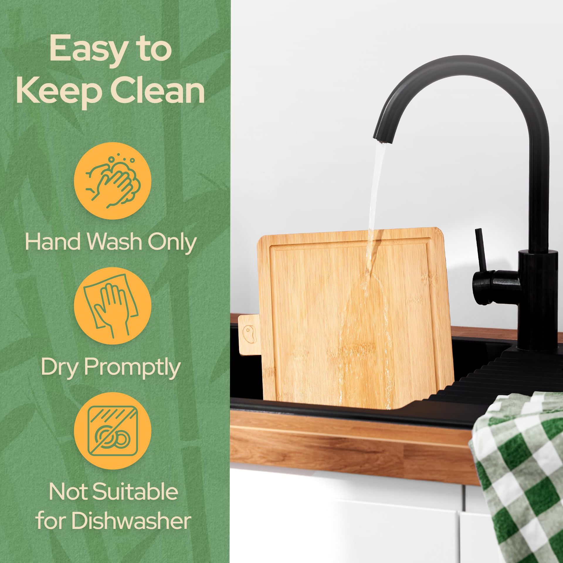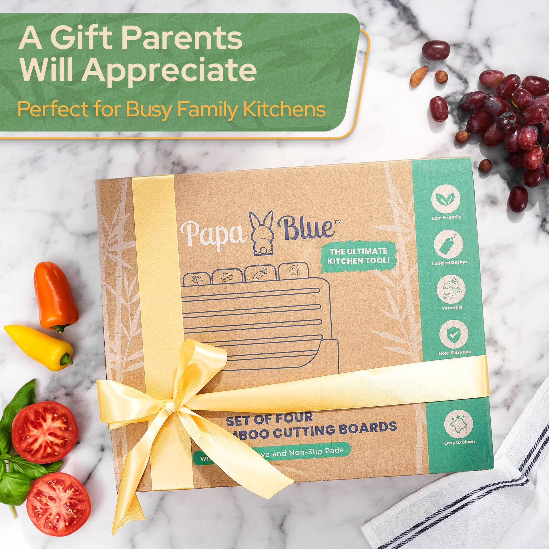 Cocina de madera de bambú tablero de corte de 4 piezas conjunto de tablero de corte de carne compartimiento tanque de jugo con icono de alimentos pan verduras frutas