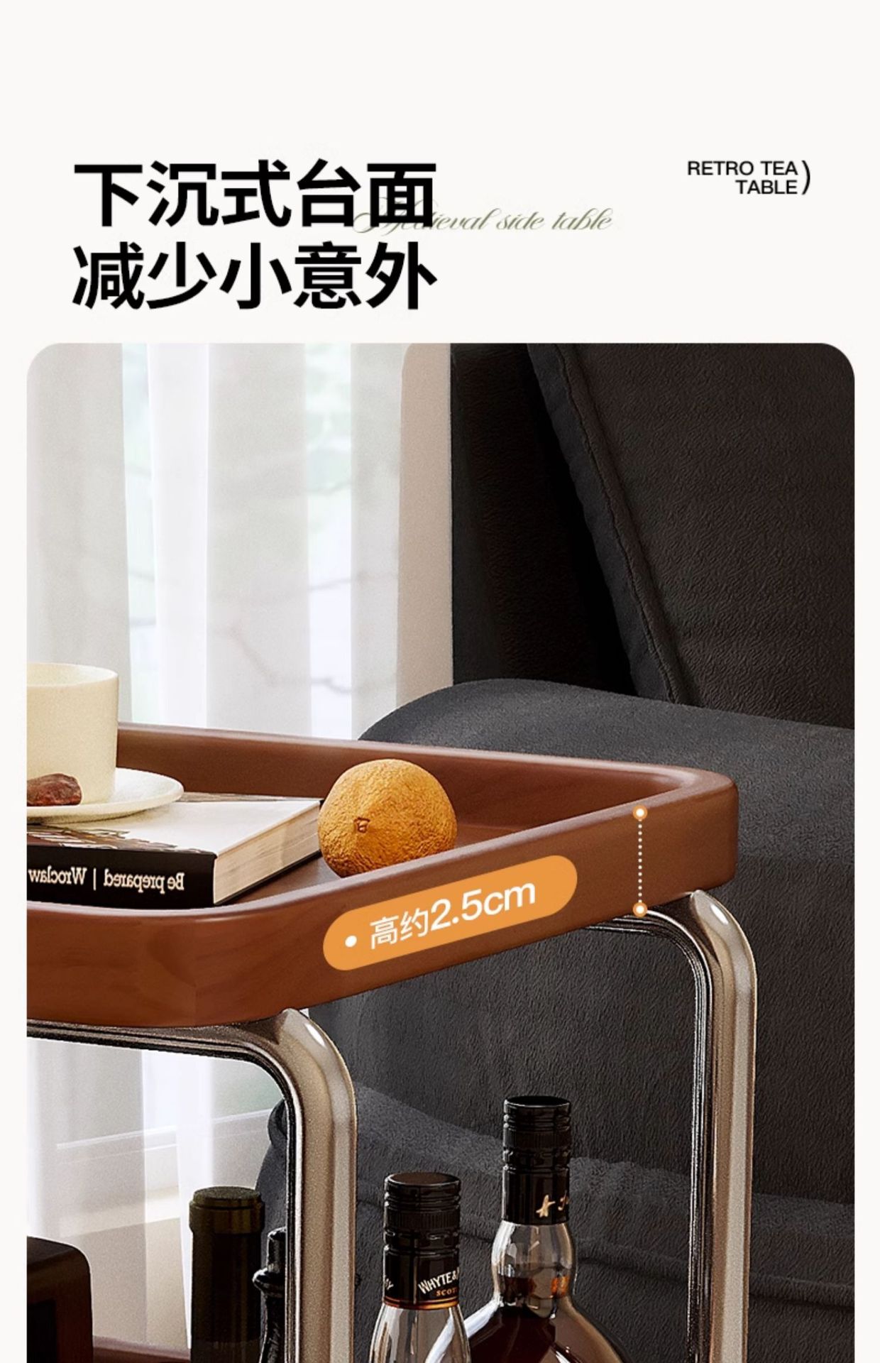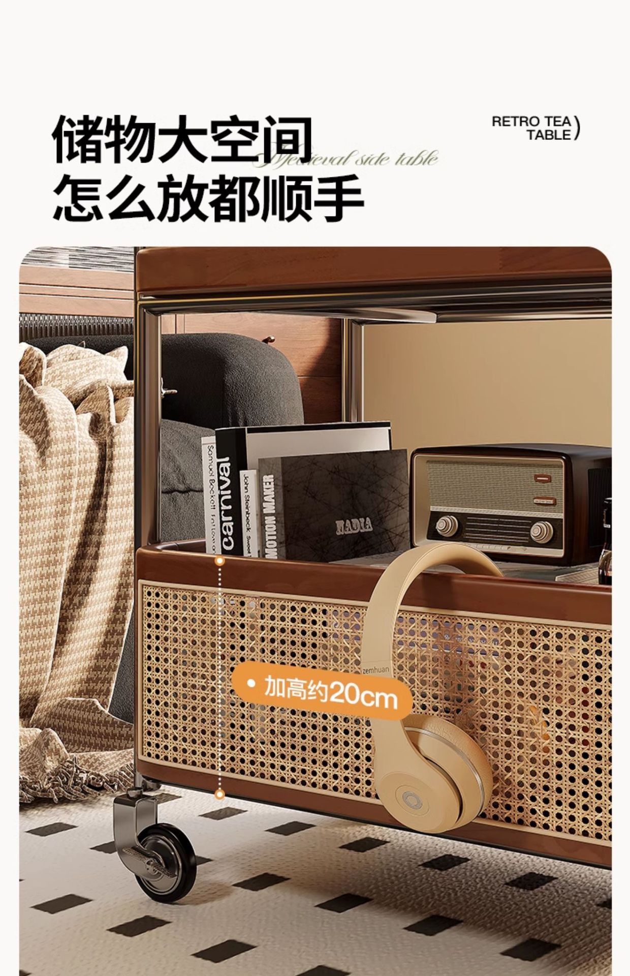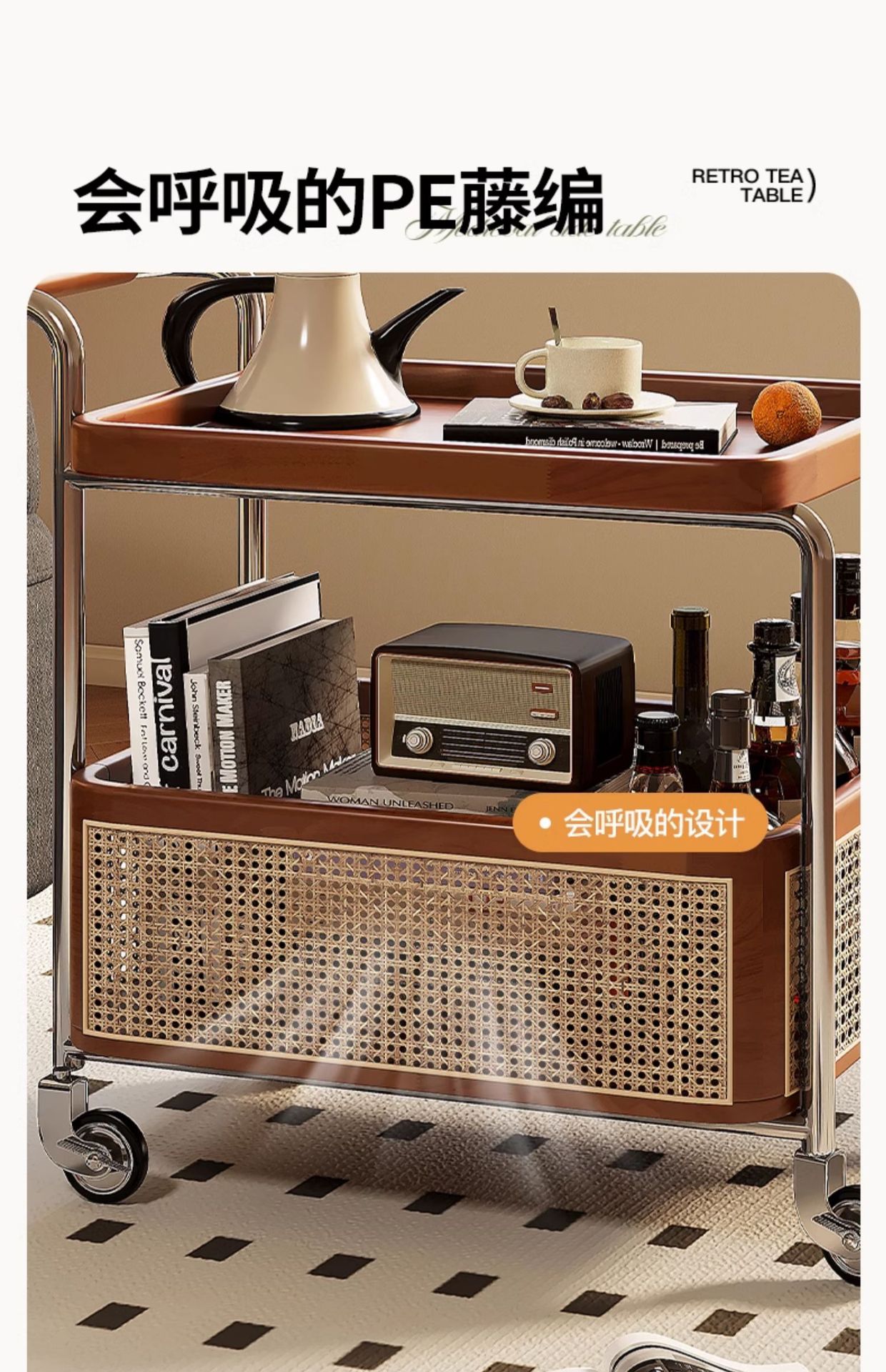 Un pequeño carro de lado móvil, sofá de sala de estar, mesa de té, nuevo estilo medieval, cocina de madera maciza, almacenamiento de estantes, carro de comedor.