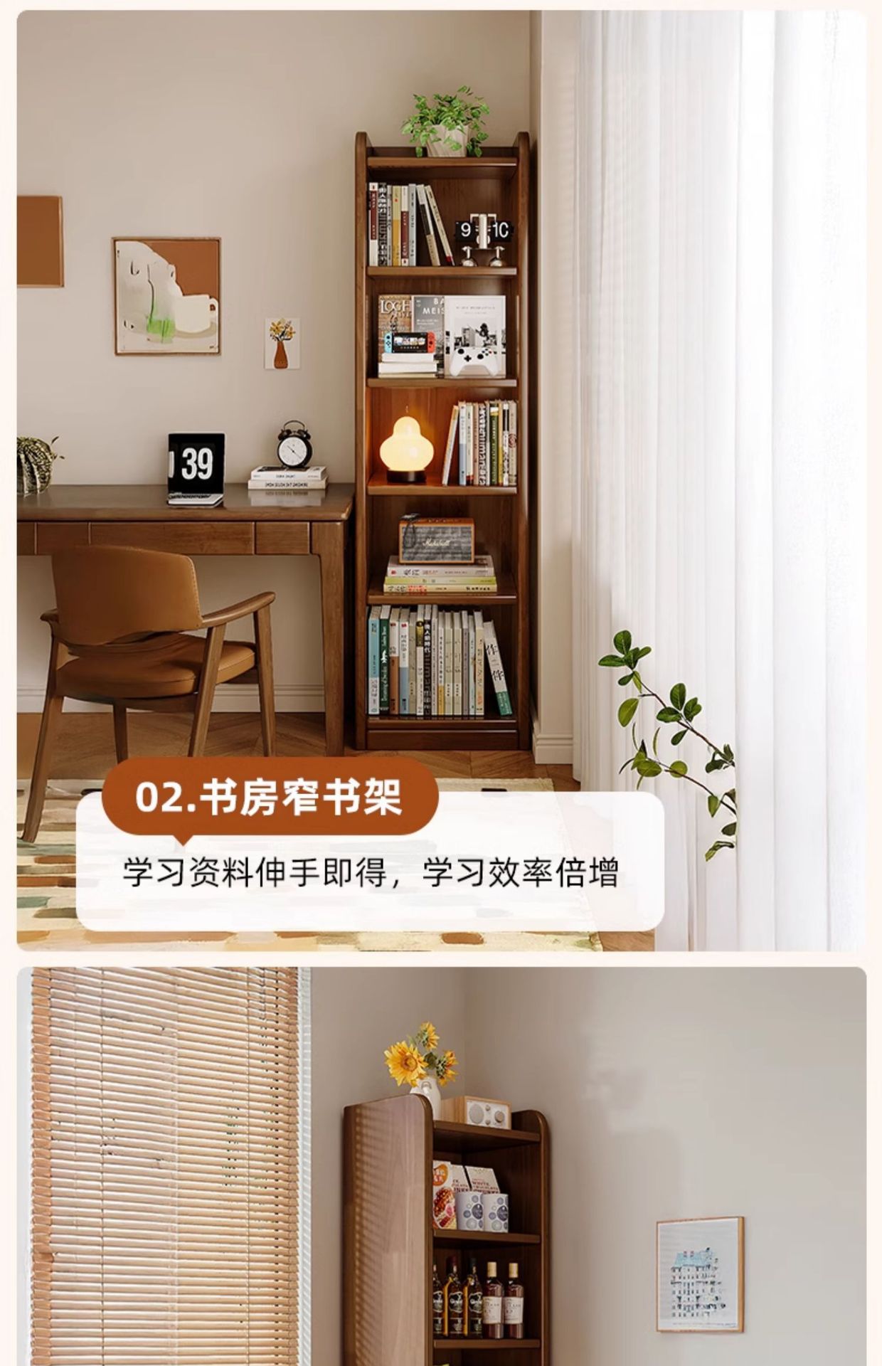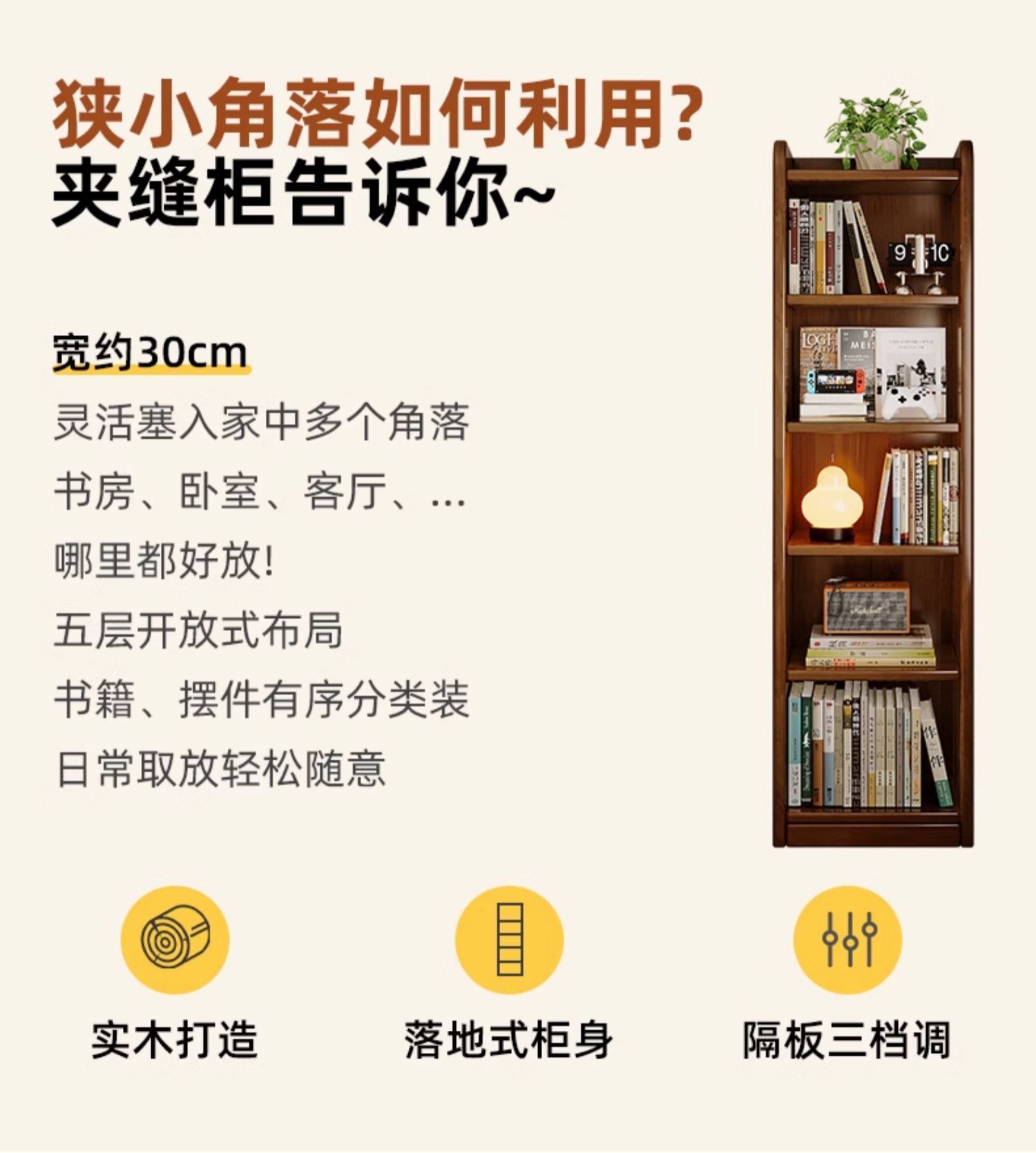 Estante de madera sólida, estante de piso, estante de almacenamiento integrado contra la pared, color de nuez, costura estrecha, armario de almacenamiento, gabinete de biblioteca doméstico