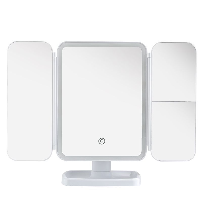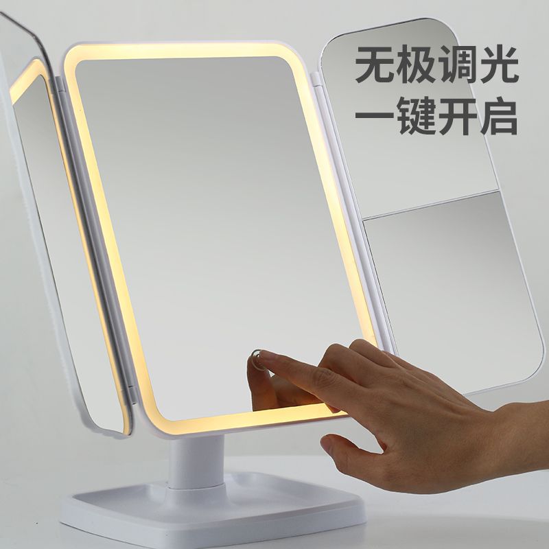 Nuevo espejo de maquillaje de escritorio LED dos en uno conchas de tres caras caja de almacenamiento plegable espejo de vestuario ajustable espejo doble abierto