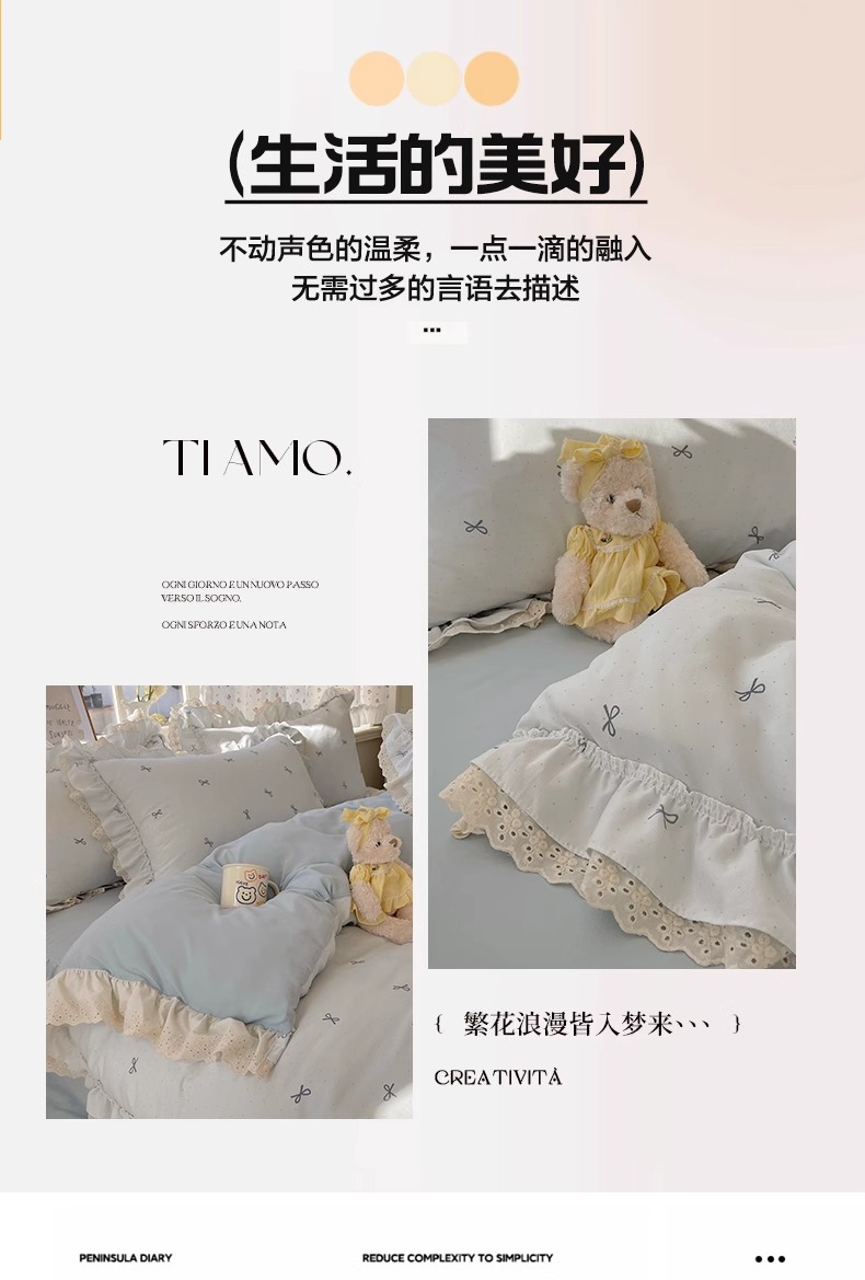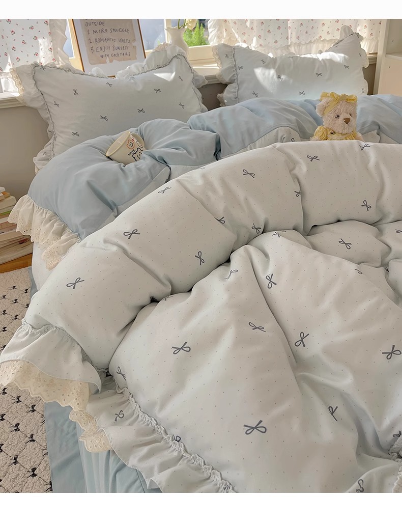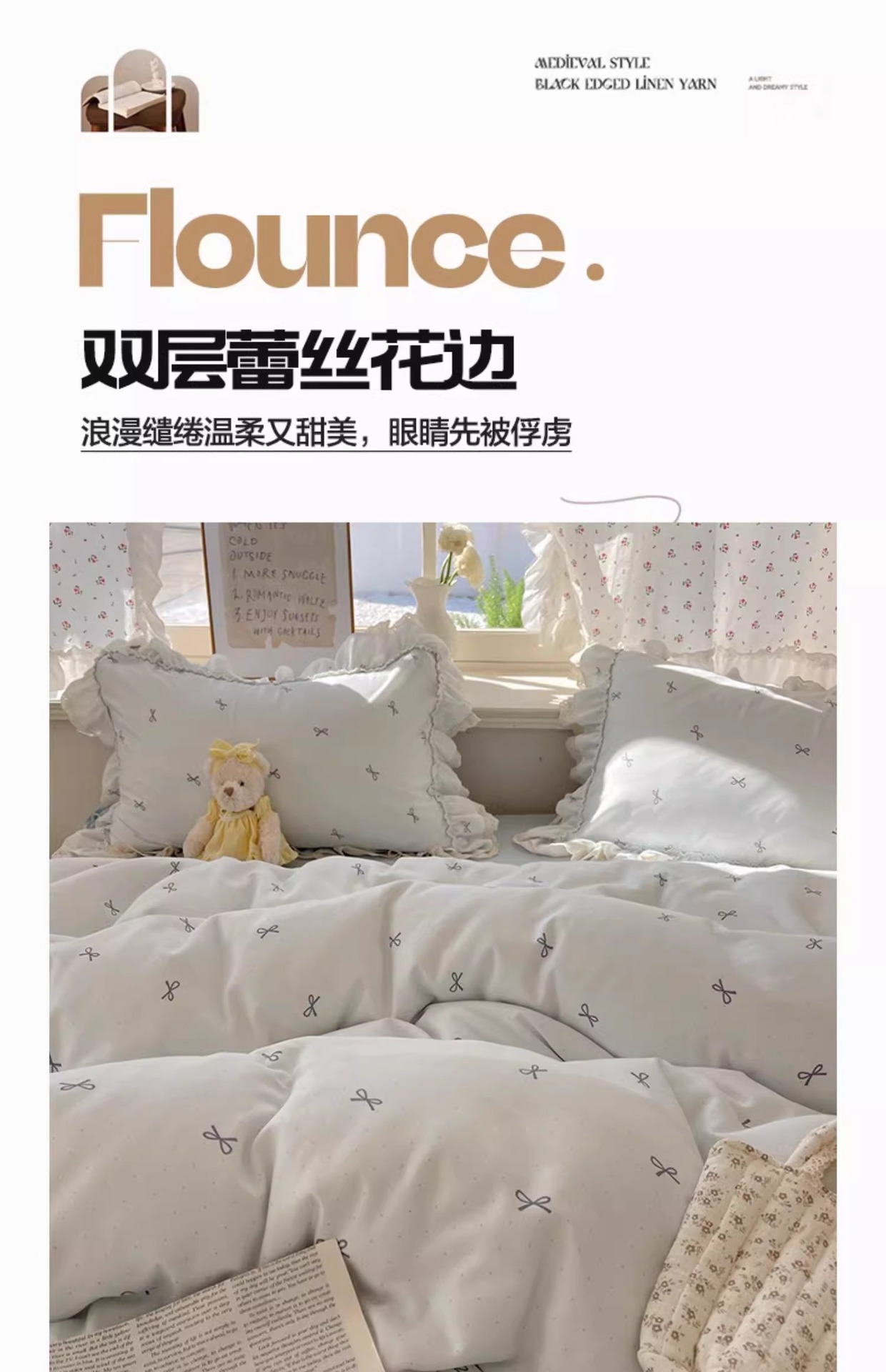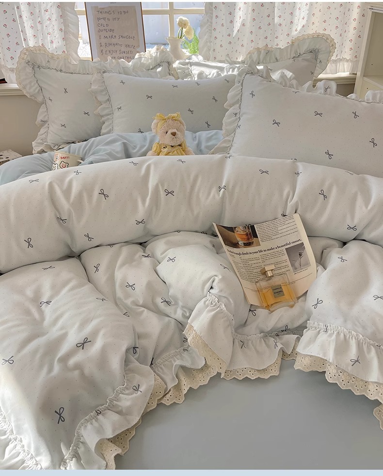 Un tipo de hilo de doble capa cama de corazón de niña coreana de cuatro piezas estilo princesa encaje funda de edredón sábana falda de cama ropa de cama 4