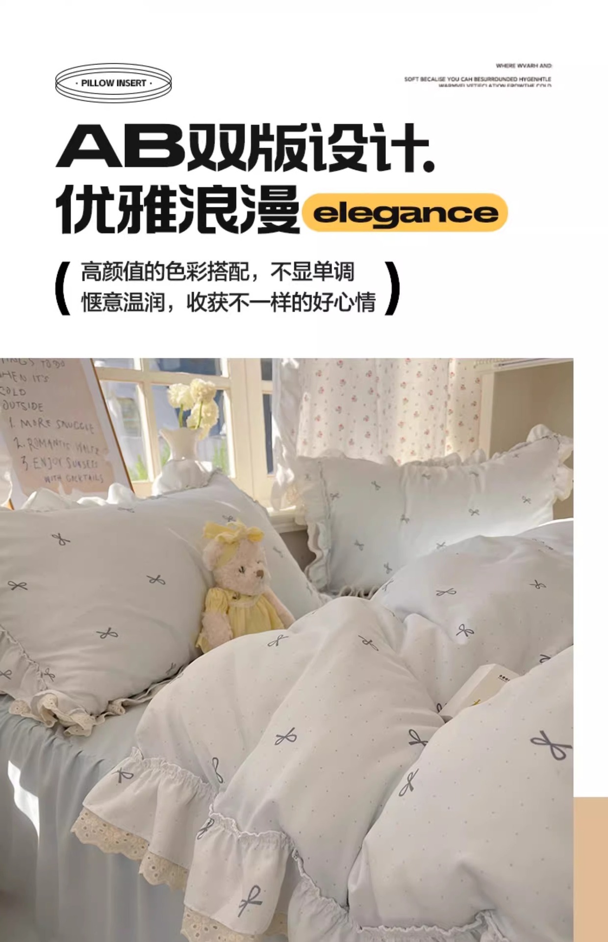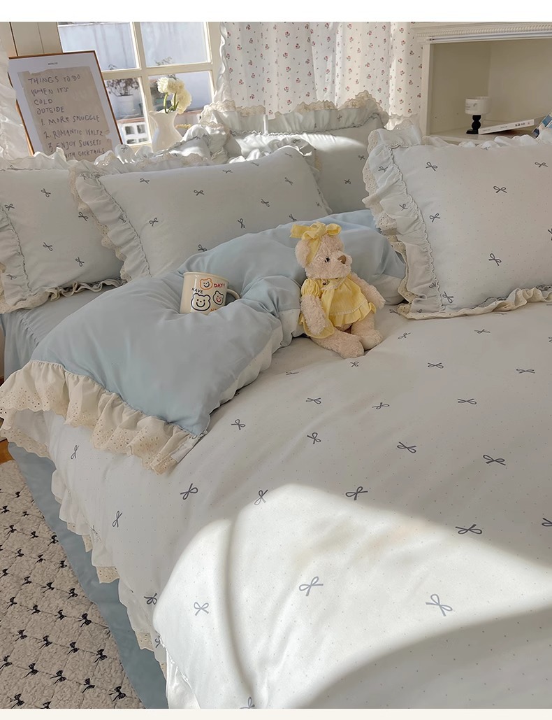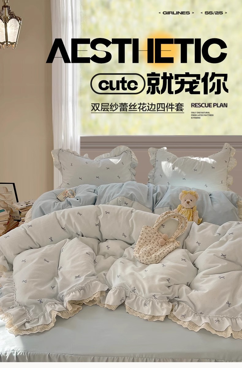 Un tipo de hilo de doble capa cama de corazón de niña coreana de cuatro piezas estilo princesa encaje funda de edredón sábana falda de cama ropa de cama 4