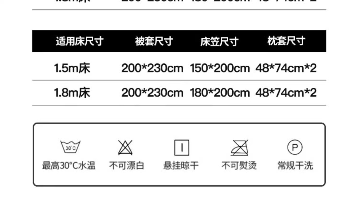| Especificaciones de tamaño | Cama de 0,9 m [Juego de sábanas de tres piezas]-Adecuado para edredón de 150x200cm,Cama de 1,2 m [Juego de sábanas de tres piezas]-adecuado para núcleo de edredón de 150x200cm,Cama de 1,5 m [Juego de sábanas de cuatro piezas]-Adecuado para edredón de 200x230cm,Cama de 1,8 m [Juego de sábanas de cuatro piezas]-Adecuado para edredón de 200x230cm,Cama de 1,5 m [juego de cuatro piezas de falda de cama]-adecuado para edredón de 200x230cm,Cama de 1,8 m [juego de cuatro piezas de falda de cama]-adecuado para edredón de 200x230cm,Cama de 1,5 m [juego de cuatro piezas de sábana]-adecuada para edredón de 200x230cm,Cama de 1,8 m [juego de cuatro piezas de sábana]-adecuado para edredón de 200x230cm |