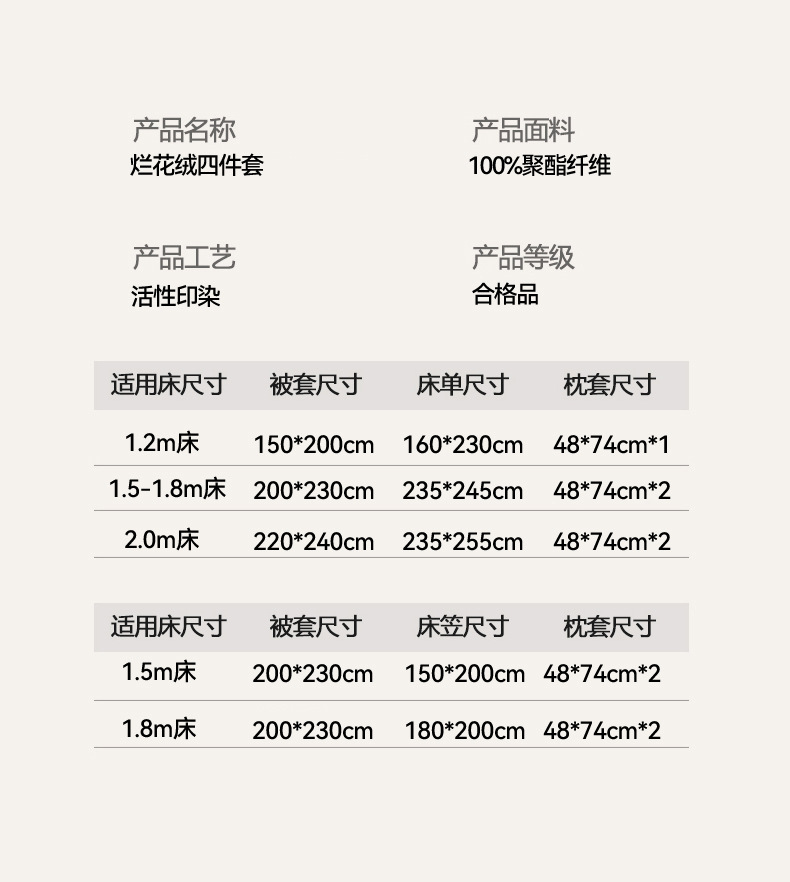 | Especificaciones de tamaño | Tres juegos de sábanas de 1,2 metros [sábanas 160x230 edredones 150x200], cuatro juegos de sábanas de 1,5 metros [sábanas 235x245 edredones 200x230], cuatro juegos de sábanas de 1,8 metros [sábanas 235x245 edredones 200x230], cuatro juegos de sábanas de 2,0 metros [sábanas 235x255 edredones 220x240], cuatro juegos de edredones de 1,5 metros [edredones 150x200 edredones 200x230], cuatro juegos de edredones de 1,8 metros [edredones 180x200 edredones 200x230] |