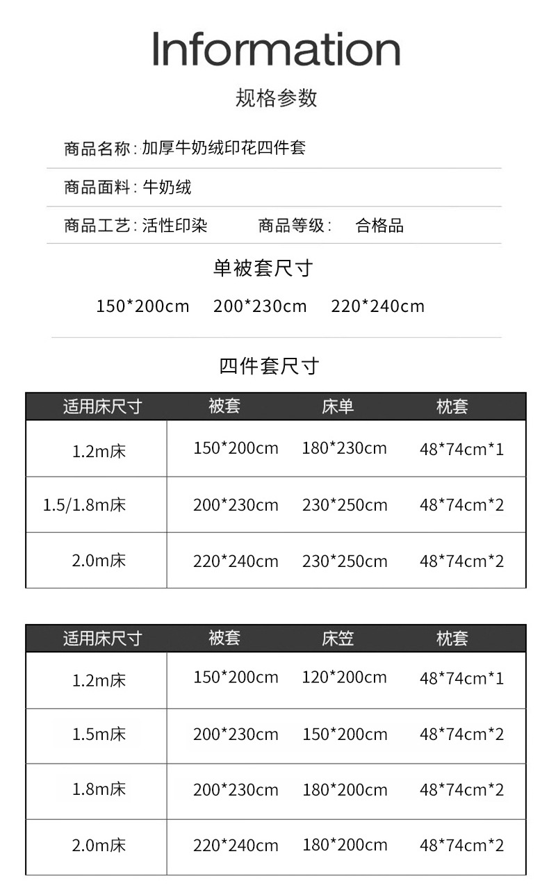 | Especificaciones de tamaño | Tres juegos de sábanas de 0,9 M [adecuado para 150 * 200 cm de edredón], tres juegos de sábanas de 1,2 m [150 * 200 cm de sábanas de 180 * 230cm], cuatro juegos de sábanas de 1,5 m [200 * 230cm de sábanas de 230 * 250cm], cuatro juegos de sábanas de 1,8 m [200 * 230cm de sábanas de 230 * 250cm], cuatro juegos de sábanas de 2,0 M [220 * 240cm de sábanas de 230 * 250cm], cuatro juegos de sábanas de 1,5 m [200 * 230cm de sábanas de 150 * 200cm], 1,8 m de sábanas de bambú, 1,8 m juego de cuatro piezas [juego de edredones 200 * 230cm juego de edredones 180 * 200cm], juego de edredones de 1,8 m más juego de edredones grandes [juego de edredones 220 * 240cm juego de edredones 180 * 200cm] |