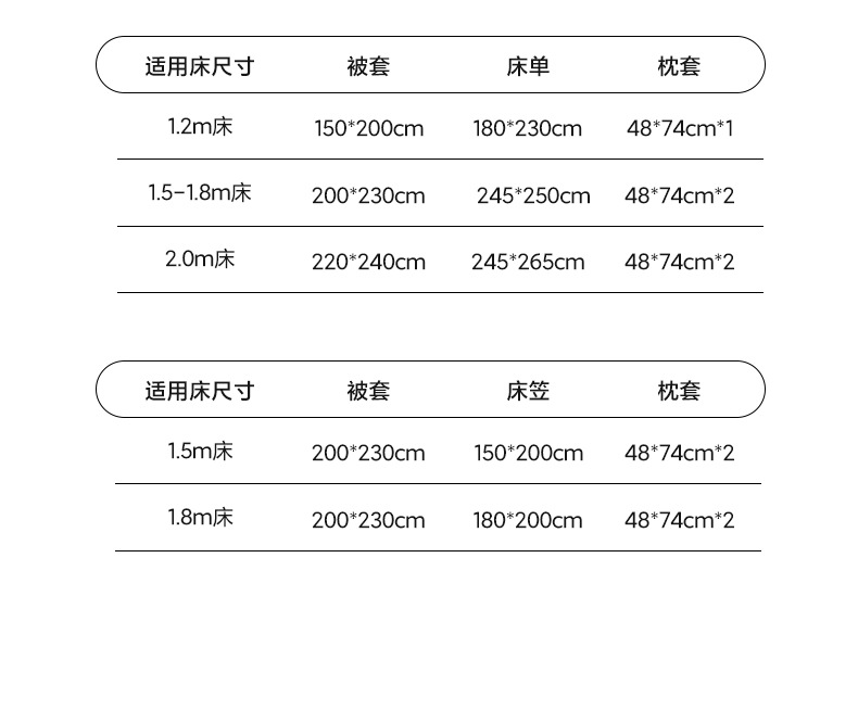 | Especificaciones de tamaño | Tres juegos de sábanas de 1,2 m [ropa de cama 150 * 200 cm + sábanas 180 * 230cm + funda de almohada * 1], cuatro juegos de sábanas de 1,5 m [ropa de cama 200 * 230cm + sábanas 245 * 250cm + funda de almohada * 2], cuatro juegos de sábanas de 1,8 m [ropa de cama 200 * 230cm + sábanas 245 * 250cm + funda de almohada * 2], cuatro juegos de sábanas de 2,0 M [ropa de cama 220 * 240cm + sábanas 245 * 265cm + funda de almohada * 2], cuatro juegos de sábanas de 1,5 m [ropa de cama 200 * 230cm + funda de almohada 150 * 200 cm + funda de almohada * 2]] juego de cuatro piezas de 1,8 m de edredón [edredón 200 * 230cm + edredón 180 * 200cm + funda de almohada * 2] |
