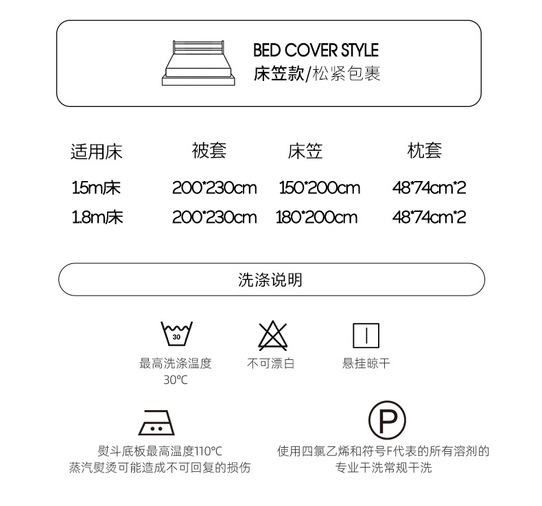 | Especificaciones de tamaño | Tres juegos de sábanas de dormitorio de 0,9 metros [adecuado para 150 * 200 cm de edredón], tres juegos de sábanas de 1,2 metros [160 x 230 edredón 150 X 200], cuatro juegos de sábanas de 1,5 metros [245 x 250 edredón 200 x 230], cuatro juegos de sábanas de 1,8 metros [245 x 250 edredón 200 x 230], cuatro juegos de sábanas de 2,0 metros [245 x 270 edredón 220 x 240], cuatro juegos de sábanas de 1,5 metros [150 x 200 edredón 200 edredón 200 x 230], cuatro juegos de sábanas de 1,8 metros [180 x 200 edredón 200 edredón 200 x 230] |