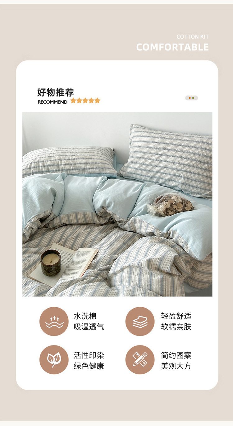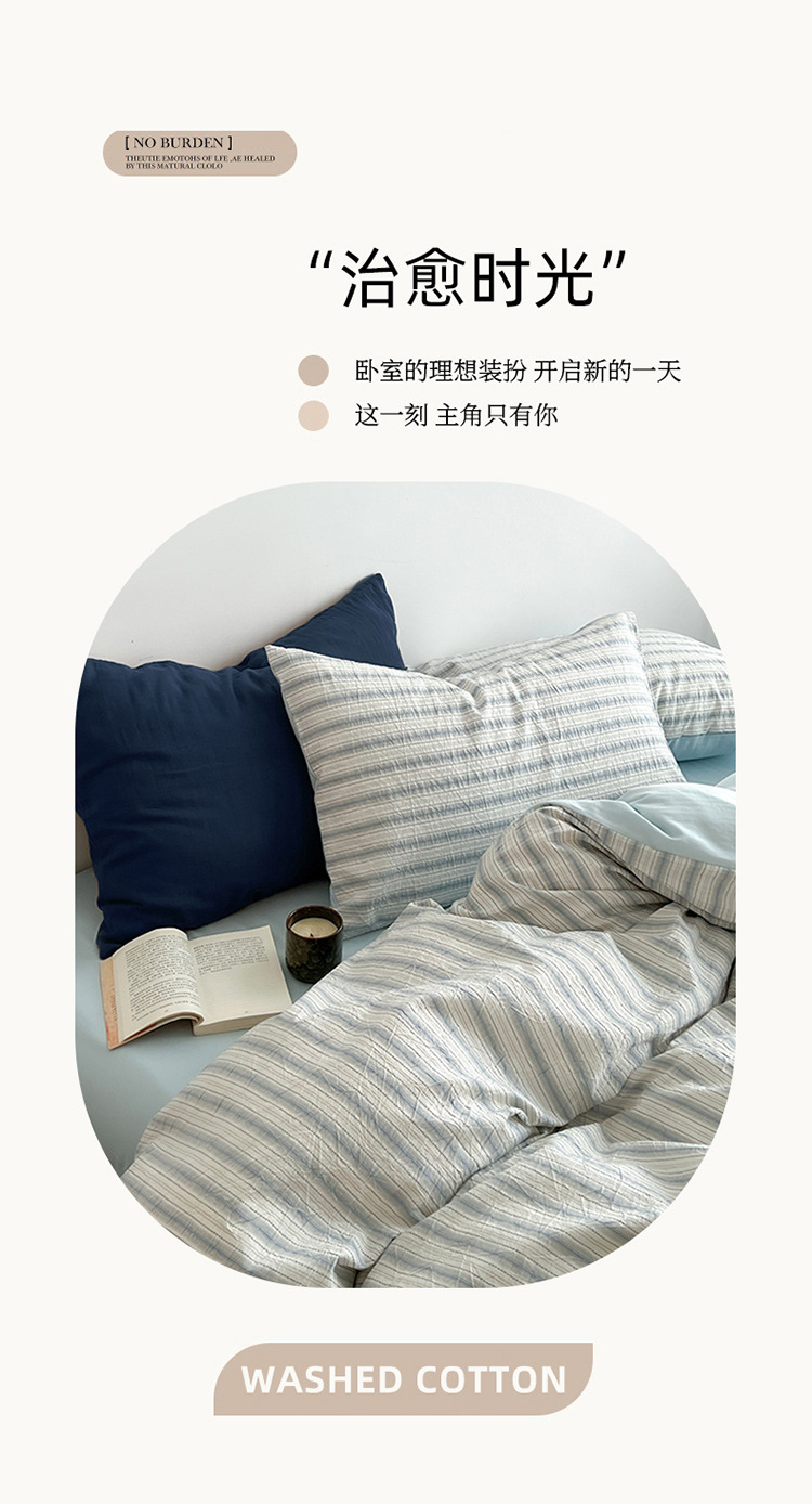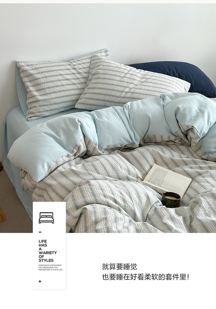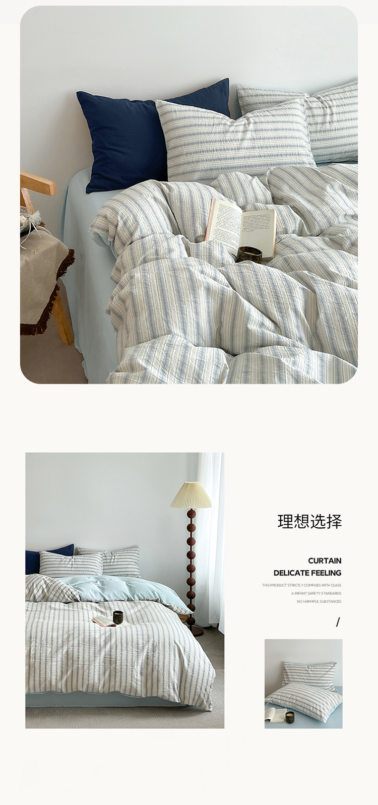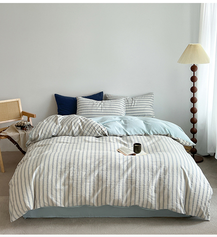 Cama a cuadros a rayas de algodón lavado de cuatro piezas, dormitorio de estudiantes de primavera y verano, sábana individual, funda de edredón, juego de tres piezas lavable a máquina
