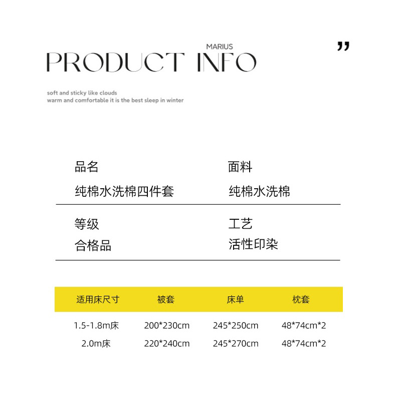 | Especificaciones de tamaño | Juego de sábanas de tres piezas de 0,9 m/1,2 m [sábanas 180x230 funda de edredón 150x200],Juego de sábanas de cuatro piezas de 1,5 m [sábanas 230x245 funda de edredón 200x230],Juego de sábanas de cuatro piezas de 1,8 m [sábanas 230x245 funda de edredón 200x230],Juego de cuatro piezas de sábanas de 2.0m [sábanas 245x250 funda de edredón 220x240],Juego de cuatro piezas de cama de 1,5 m [funda de cama 150x200 edredón 200x230],Juego de cuatro piezas de cama de 1,8 m [Juego de cama de 180x200 funda de edredón 200x230] |