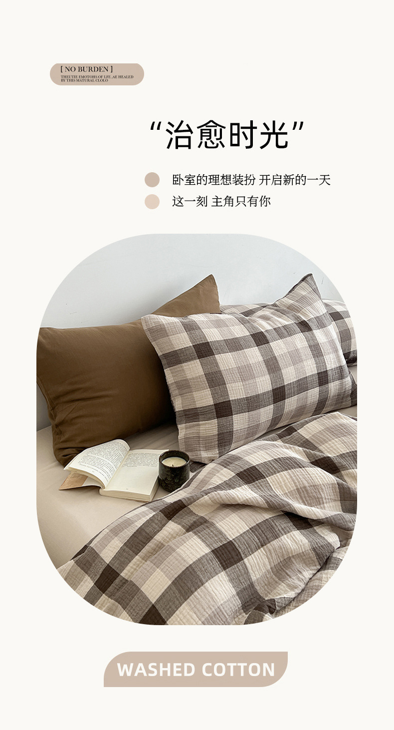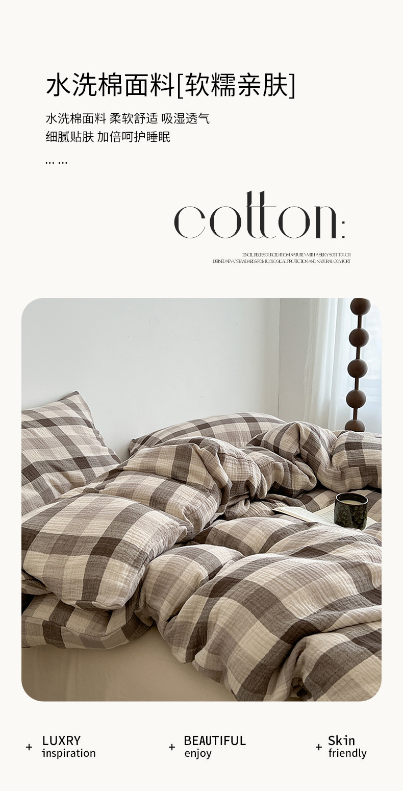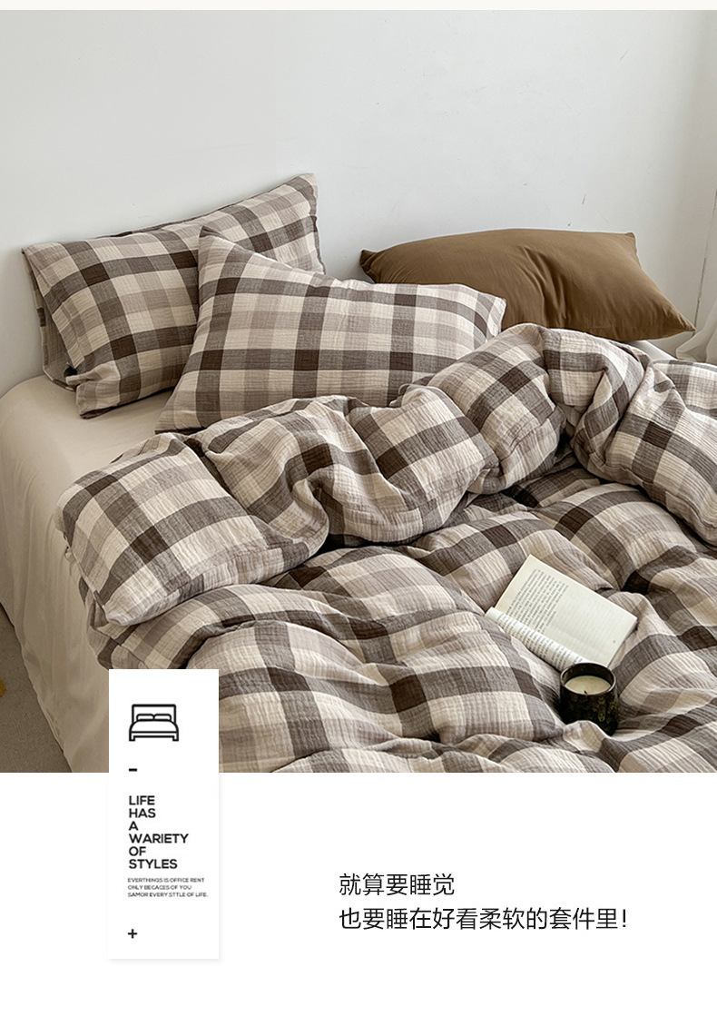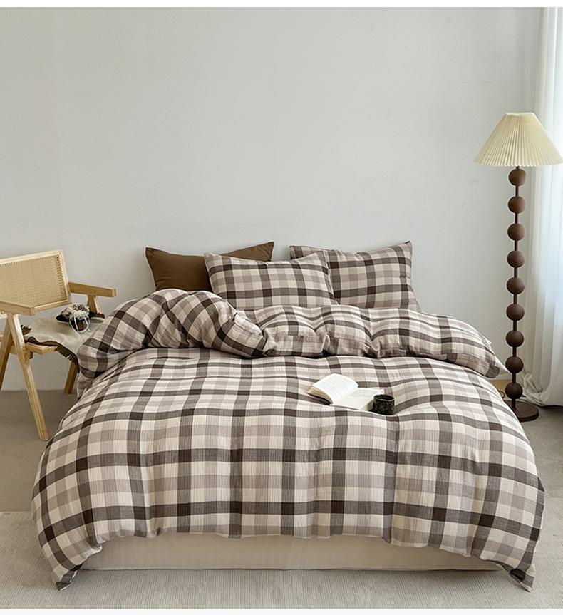 Cama a cuadros a rayas de algodón lavado de cuatro piezas, dormitorio de estudiantes de primavera y verano, sábana individual, funda de edredón, juego de tres piezas lavable a máquina