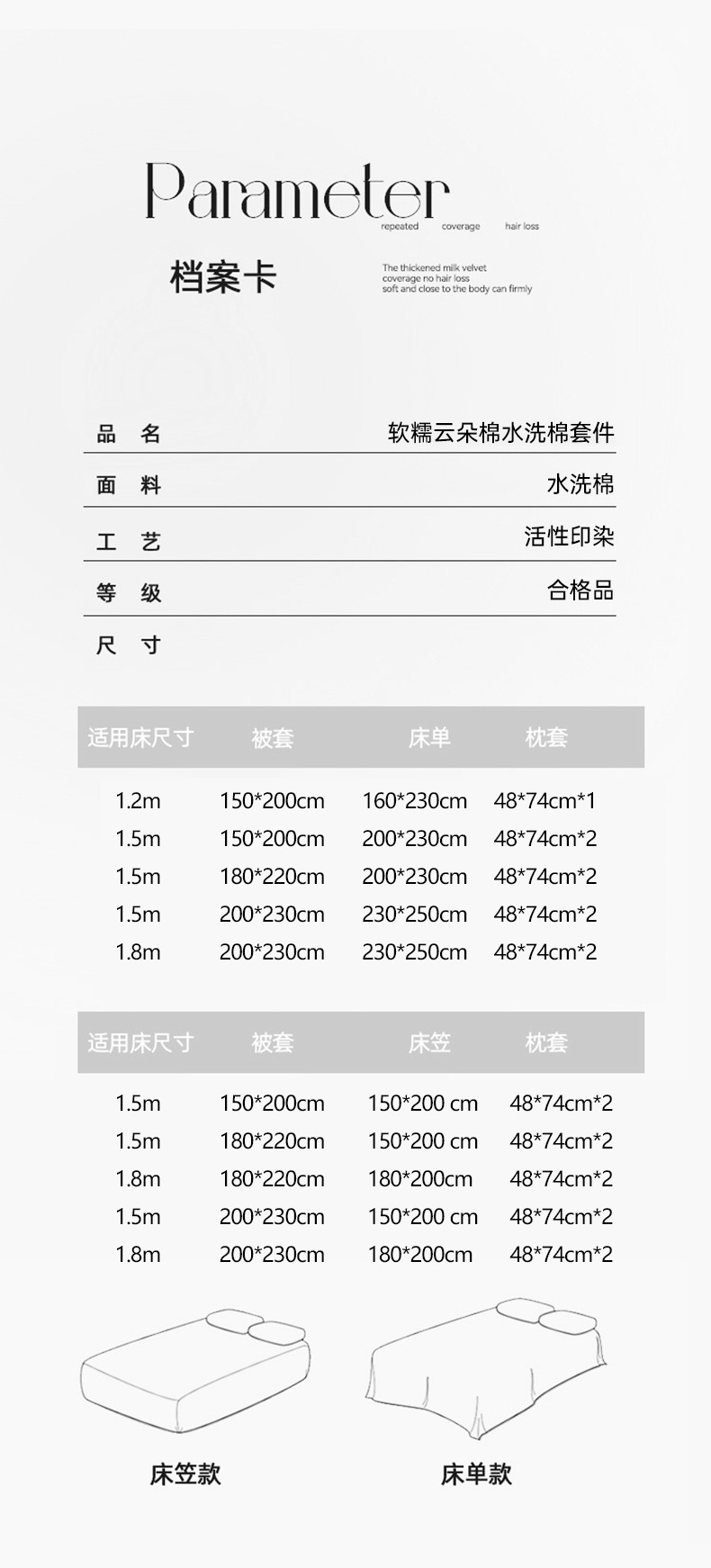 | Especificaciones de tamaño | Juego de tres piezas de sábanas de dormitorio de 0,9-1,2 m [funda de edredón 150*200 sábanas 160*230],Juego de sábanas de dormitorio de 1,2 m de cuatro piezas [funda de edredón 150*200 sábanas 200*230],Juego de cuatro piezas de sábanas 1.35m [funda de edredón 180*220 sábanas 200*230],Juego de sábanas de cuatro piezas de 1,5 m [funda de edredón 200*230 sábanas 230*250],Juego de sábanas de cuatro piezas de 1,8 m [funda de edredón 200*230 sábanas 230*250],1.5 Funda de cama [Funda de edredón 200*230 Funda de cama 150*200],1.8 Sombrilla de cama [Funda de edredón 200*230 Sombrilla de cama 180*200] |