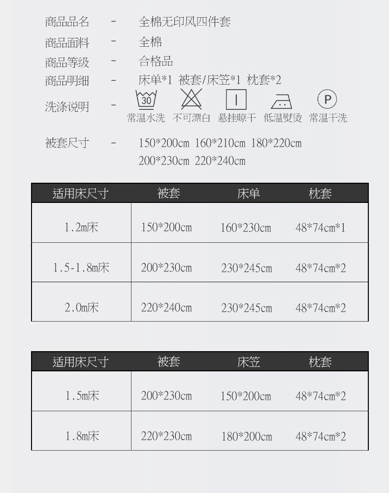 | Especificaciones de tamaño | [Juego de tres piezas] para dormitorios de estudiantes [para edredones de 150x200cm],Juego de sábanas de tres piezas de 1,2 m [sábanas 160x230 funda de edredón 150x200],Juego de sábanas de cuatro piezas de 1,5 m [sábanas 230x245 funda de edredón 200x230],Juego de sábanas de cuatro piezas de 1,8 m [sábanas 230x245 funda de edredón 200x230],Juego de sábanas de cuatro piezas de 2,0 m [sábanas 230x245 funda edredón 220x240],Juego de cuatro piezas de cama de 1,5 m [funda de cama 150x200 edredón 200x230],Juego de cuatro piezas de cama de 1,8 m [Juego de cama de 180x200 funda de edredón 200x230] |