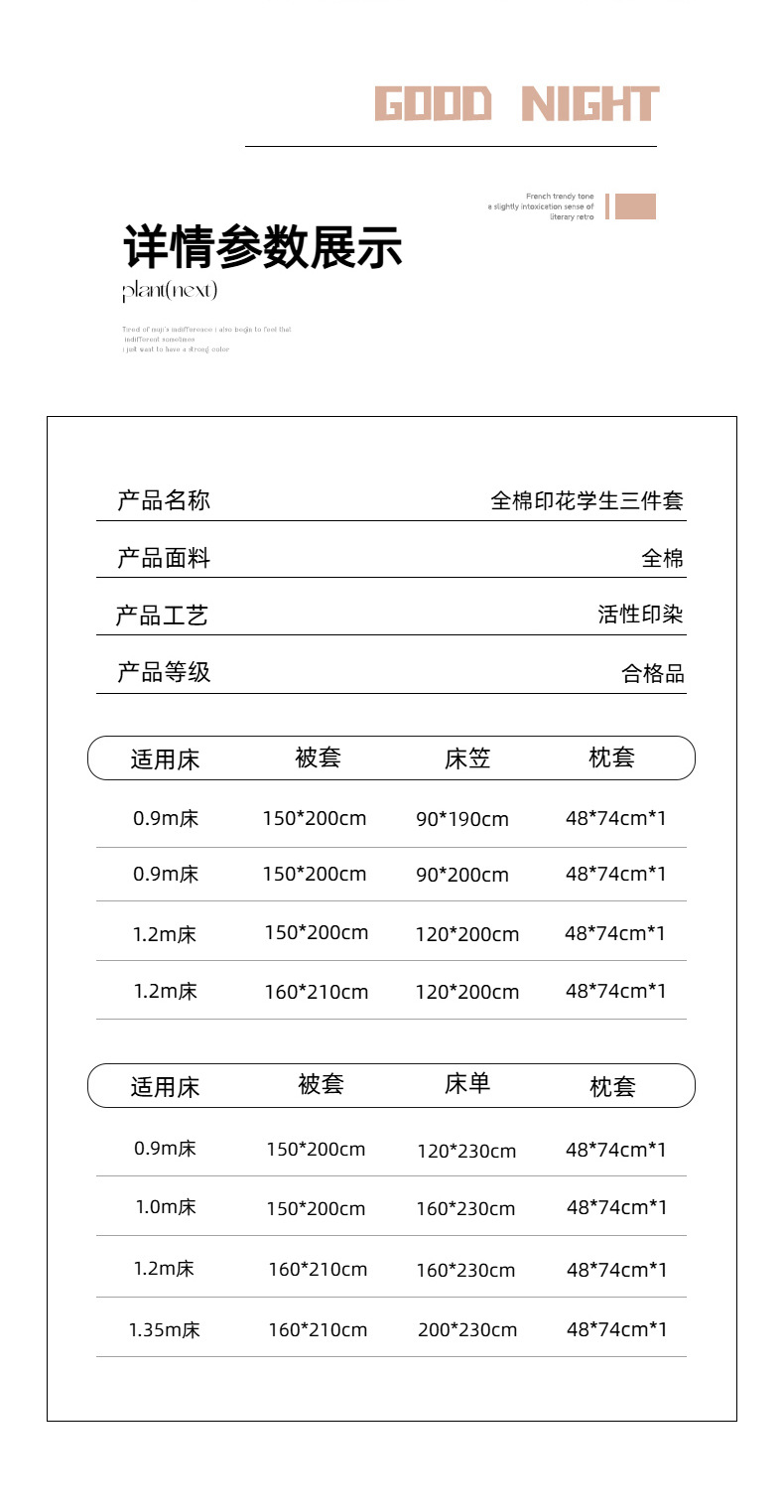 | Especificaciones de tamaño | Juego de tres piezas para estudiantes de 0,9 m estilo sábana [funda de edredón 150*200cm sábana 120*230cm],Juego de sábanas de 1,2 m de tres piezas [funda de edredón 150*200cm sábanas 160*230cm],Cama de 1,5 m [Juego de sábanas de cuatro piezas]-Adecuado para edredón de 200x230cm,Cama de 1,8 m [Juego de sábanas de cuatro piezas]-Adecuado para edredón de 200x230cm,Cama de 2.0m [Juego de sábanas de cuatro piezas]-Adecuado para edredón de 220x240cm,Cama de 1,5 m [juego de cuatro piezas de sábana]-adecuada para edredón de 200x230cm,Cama de 1,8 m [juego de cuatro piezas de sábana]-adecuado para edredón de 200x230cm |