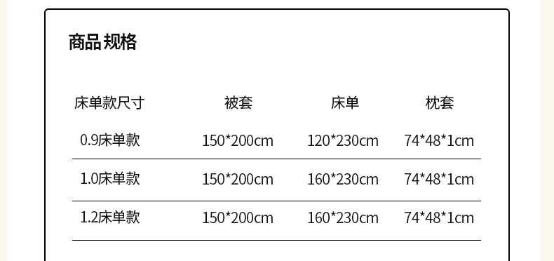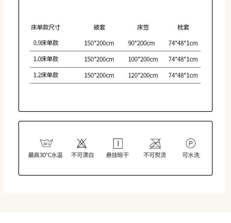 | Especificaciones de tamaño | Juego de sábanas de tres piezas de 0,9 m [funda de edredón 150*200cm sábanas 120*230cm],Sábana de tres piezas de 1.0m [funda de edredón 150*200cm sábana 160*230cm],Juego de sábanas de 1,2 m de tres piezas [funda de edredón 150*200cm sábanas 160*230cm],Juego de sábanas de cuatro piezas de 1,5 m [funda de edredón 200*230cm sábanas 230*250cm],Juego de cuatro piezas de cama de 1,8 m [funda de edredón 200*230cm sábana 230*250cm],Juego de cuatro piezas de sábanas de 2.0m [funda de edredón 220*240cm sábanas 230*250cm],Juego de tres piezas de cama de 0,9 m [funda de edredón 150*200cm funda de cama 90*200cm],Sombrilla de cama de tres piezas de 1.0m [funda de edredón 150*200cm Sombrilla de cama 100*200cm],Juego de cama de 1,2 m de tres piezas [funda de edredón 150*200cm funda de cama 120*200cm],Juego de cuatro piezas de cama de 1,5 m [funda de edredón 200*230cm funda de cama 150*200cm],Juego de cuatro piezas de cama de 1,8 m [funda de edredón 200*230cm funda de cama 180*200cm] |
