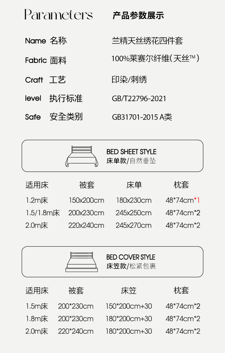 | Especificaciones de tamaño | Juego de sábanas de tres piezas de 0,9 m [adecuado para camas de dormitorio de estudiantes de 90x200cm],Juego de tres piezas de 1,2 m [funda de edredón 150x200cm, sábana 180x230cm, funda de almohada 48x74cmx1],Juego de cuatro piezas de 1,5 m [funda de edredón 200x230cm, sábana 245x250cm, funda de almohada 48x74cmx2],Juego de cuatro piezas de 1,8 m [funda de edredón 200x230cm, sábana 245x250cm, funda de almohada 48x74cmx2],Juego de cuatro piezas de 2,0 m [funda de edredón 220x240cm, sábana 245x270cm, funda de almohada 48x74cmx2],Juego de cuatro piezas de cama de 1,5 m [funda de edredón 200x230cm, funda de cama 150x200cm, funda de almohada 48x74cmx2],Juego de cuatro piezas de cama de 1,8 m [funda de edredón 200x230cm, funda de cama 180x200cm, funda de almohada 48x74cmx2],Juego de cuatro piezas de cama de 2.0m [funda de edredón 220x240cm, funda de cama 180x200cm, funda de almohada 48x74cmx2] |