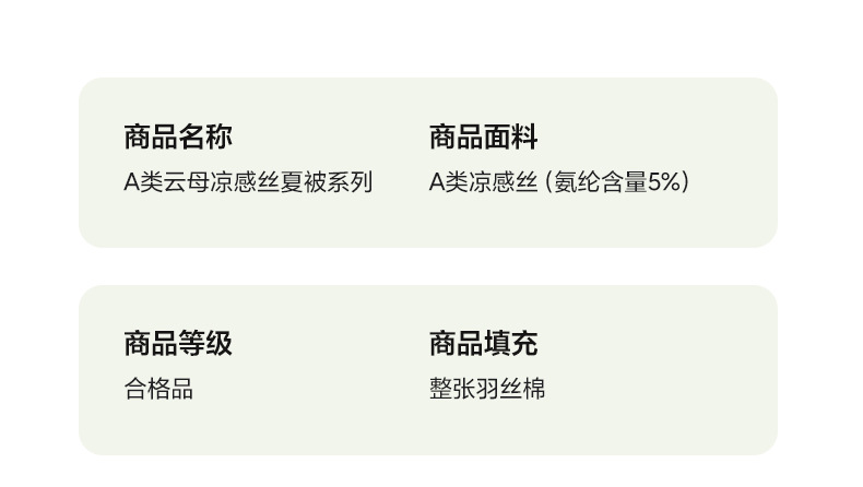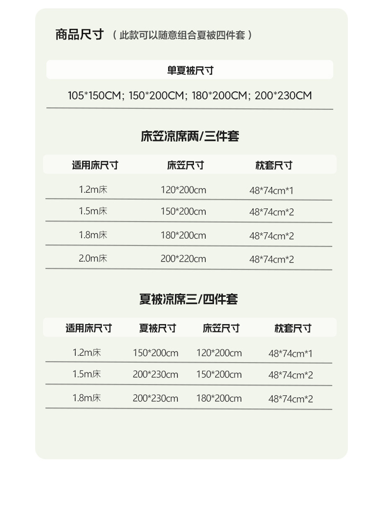 | Especificaciones de tamaño | Tela de verano individual: 150x200cm [Tejido de seda fresco de mica estándar de clase A],Tela de verano individual: 180x200cm [Tejido de seda fresco de mica estándar de clase A],Tela de verano única: 200x230cm [Tejido de seda fresca de mica estándar de clase A],Juego de cama de tres piezas de 1,2 m [edredón de verano de 150x200cm funda de almohada de cama de 120x200cm],Juego de cuatro piezas de cama de 1,5 m [200x230cm edredón de verano 150x200cm funda de almohada de cama dos],Juego de cuatro piezas de cama de 1,8 m [edredón de verano de 200x230cm Dos fundas de almohada de cama de 180x200cm] |