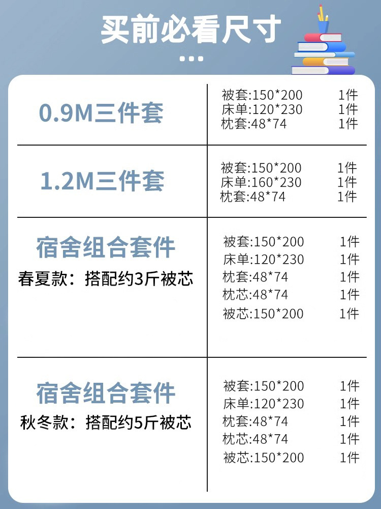 | Especificaciones de tamaño | Juego de cama de estudiante de tres piezas de 0,9/1,2 m [sábanas, funda de edredón, funda de almohada],Cama de estudiante de cuatro piezas de 0,9/1,2 m [núcleo de almohada de tres piezas],Primavera y verano: traje de cama de estudiante de cuatro piezas de 0,9/1,2 m [traje de tres piezas de aproximadamente 3 kg de edredón],Otoño e invierno: traje de cuatro piezas de cama para estudiantes de 0,9/1,2 m [traje de tres piezas de aproximadamente 5 kg de edredón],Primavera y verano: juego de cinco piezas de cama para estudiantes de 0,9/1,2 m [núcleo de almohada de tres piezas de aproximadamente 3 kg de núcleo de edredón],Otoño e invierno: traje de cinco piezas de cama para estudiantes de 0,9/1,2 m [núcleo de almohada de tres piezas de aproximadamente 5 kg de edredón] |