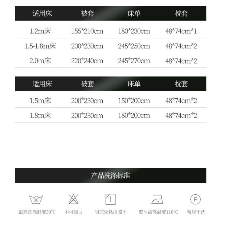 | Especificaciones de tamaño | Cama de 1,2 m [dormitorio de tres piezas]-Adecuado para edredón 150x200,Cama de 1,5 m [Juego de sábanas de cuatro piezas]-Adecuado para edredón 200x230,Cama de 1,8 m [Juego de sábanas de cuatro piezas]-Adecuado para edredón 200x230,Cama de 2.0m [Juego de sábanas de cuatro piezas]-Adecuado para edredón de 220x240,Cama de 1,5 m [juego de cuatro piezas de sábana]-Adecuado para edredón 200x230,Cama de 1,8 m [juego de cuatro piezas de sábana]-Adecuado para edredón 200x230 |