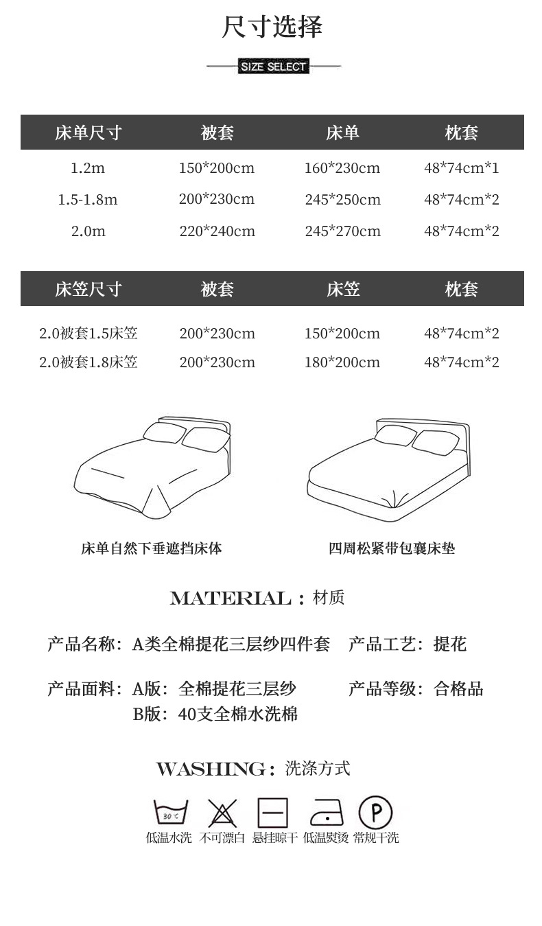 | Especificaciones de tamaño | Juego de sábanas de cuatro piezas de 1,5 m [sábanas 245x250 funda de edredón 200x230],Juego de sábanas de cuatro piezas de 1,8 m [sábanas 245x250 funda de edredón 200x230],Juego de sábanas de cuatro piezas de 2,0 m [sábanas 245x270 funda edredón 220x240],Juego de cuatro piezas de cama de 1,5 m [funda de cama 150x200 edredón 200x230],Juego de cuatro piezas de cama de 1,8 m [Juego de cama de 180x200 funda de edredón 200x230],Juego de sábanas de tres piezas de 1,2 m [sábanas 160x230 funda de edredón 150x200] |