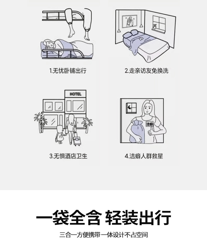 Saco de dormir sucio de hotel de algodón puro, sábana de viaje, funda de edredón, juego portátil de cuatro piezas para viajes de negocios