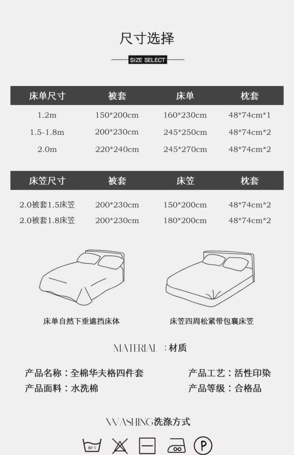 | Especificaciones de tamaño | Cama de 0,9 m [traje de tres piezas para dormitorio de estudiantes] Adecuado para edredón de 150x200cm,Cama de 1,2 m [Juego de sábanas de tres piezas] Adecuado para edredón de 150x200cm,Cama de 1,5 m [Juego de sábanas de cuatro piezas] Adecuado para edredón de 200x230cm,Cama de 1,8 m [Juego de sábanas de cuatro piezas] Adecuado para edredón de 200x230cm,Cama de 2.0m [Juego de sábanas de cuatro piezas] Adecuado para edredón de 220x240cm,Cama de 1,5 m [juego de cuatro piezas de sábana] Adecuado para edredón de 200x230cm,Cama de 1,8 m [juego de cuatro piezas de sábana] Adecuado para edredón de 200x230cm |