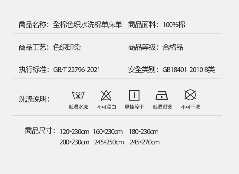 | Especificaciones de tamaño | Sábana individual-120*230cm [adecuado para cama de 0,9 m],Sábanas individuales-160*230cm [adecuado para una cama de 1,2 m],Sábanas individuales-200*230cm [adecuado para camas de 1,5 m],Sábanas individuales-245*250cm [adecuado para cama de 1,8 m],Sábanas individuales-245*270cm [adecuado para una cama de 2.0m],[Juego de sábanas de dos piezas] Una funda de almohada para sábanas de 120*230cm,[Juego de sábanas de dos piezas] Una funda de almohada para sábanas de 160*230cm,[Juego de sábanas de tres piezas] Un par de fundas de almohada para sábanas de 200*230cm,[Juego de sábanas de tres piezas] Un par de fundas de almohada para sábanas de 245*250cm,[Juego de sábanas de tres piezas] Un par de fundas de almohada para sábanas de 245*270cm,Sombrilla individual: 120x200cm [adecuado para 4-25cm de espesor interior],Sombrilla individual: 150x200cm [adecuado para 4-25cm de espesor interior],[Juego de dos piezas]: una funda de almohada de 120x200cm,[Juego de cama de tres piezas]: un par de fundas de almohada de cama de 150x200cm,Sombrilla individual: 180x200cm [adecuado para 4-25cm de espesor interior],[Juego de cama de tres piezas]: un par de fundas de almohada de cama de 180x200cm |