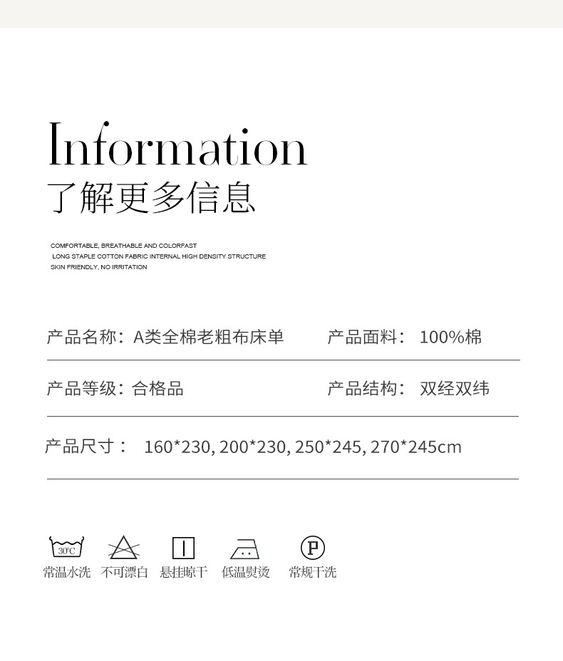 | Especificaciones de tamaño | Sábanas individuales: 160*230cm [adecuado para camas de 0,9-1,2 m],Sábanas individuales: 200*230cm [adecuado para camas de 1,5-1,8 m],Sábanas individuales: 245*250cm [adecuado para camas 1.8-2.0m],Sábanas individuales: 245*270cm [adecuado para el tamaño de la cama de 2.0m],Sábana de dos piezas: 160*230cm una funda de almohada,Juego de sábanas de tres piezas: 200*230cm par de fundas de almohada,Juego de sábanas de tres piezas: 245*250cm par de fundas de almohada,Juego de sábanas de tres piezas: 245*270cm par de fundas de almohada,Sombrilla individual: 120*200cm [aplicable a una altura interna de 5-25cm],Sombrilla individual: 150*200cm [aplicable a una altura interna de 5-25cm],Sombrilla individual: 180*200cm [aplicable a una altura interna de 5-25cm],Sombrilla de cama de dos piezas: una funda de almohada de 120*200cm,Sombrilla de cama de tres piezas: un par de fundas de almohada de 150*200cm,Sombrilla de cama de tres piezas: un par de fundas de almohada de 180*200cm |