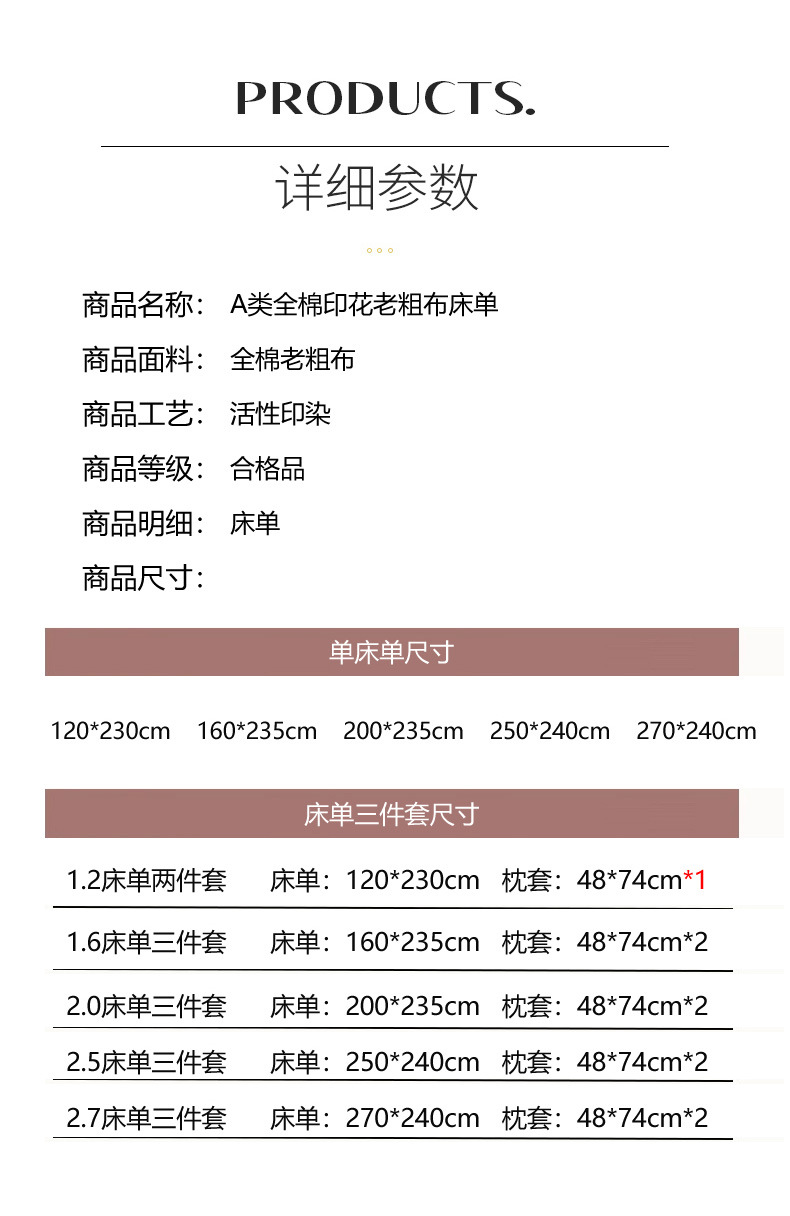 | Especificaciones de tamaño | Sábanas individuales-120x230cm [cama de 0,9 m aplicable],Sábana individual-160x235cm [para cama 1.2m],Sábanas individuales-200x235cm [cama de 1,35 m],Sábana individual-250x240cm [para cama 1.5-1.8m],Sábanas individuales-270x240cm [cama de 2.0m aplicable],Juego de sábanas de dos piezas-[Funda de almohada de sábana de 120x230cm],Juego de sábanas de tres piezas-[Un par de fundas de almohada para sábanas de 160x235cm],Juego de sábanas de tres piezas-[Un par de fundas de almohada para sábanas de 200x235cm],Juego de sábanas de tres piezas-[Un par de sábanas y fundas de almohada de 250x240cm],Juego de sábanas de tres piezas-[Un par de fundas de almohada para sábanas de 270x240cm],Sombrilla de cama de una sola pieza-90*200cm [Adecuado para colchones de espesor de 3-25cm],Sombrilla de cama de una sola pieza-120*200cm [Adecuado para colchones de espesor de 3-25cm],Sombrilla de cama de una sola pieza-150*200cm [Adecuado para colchones de espesor de 3-25cm],Sombrilla de cama de una sola pieza-180*200cm [Adecuado para colchones de espesor de 3-25cm],Sombrilla de cama de una sola pieza-200*220cm [Adecuado para colchones de espesor de 3-25cm],Sombrilla de cama de dos piezas-[Funda de almohada de cama de 90*200cm],Sombrilla de cama de dos piezas-[Funda de almohada de cama de 120*200cm],Juego de sábanas de tres piezas: [un par de sábanas y fundas de almohada de 150*200cm],Juego de sábanas de tres piezas: [un par de sábanas y fundas de almohada de 180*200cm],Juego de sábanas de tres piezas: [un par de fundas de almohada de 200*220cm] |