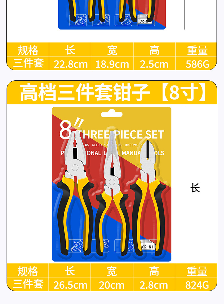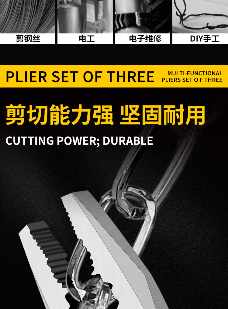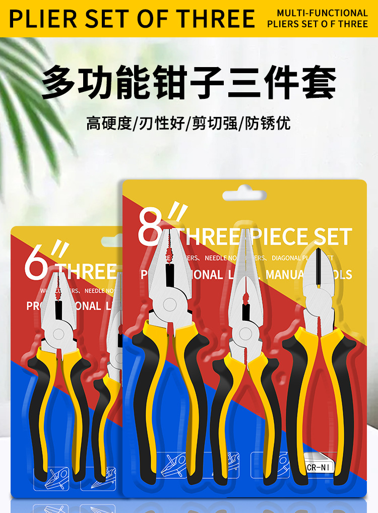 Alicates transfronterizos exclusivos de alta gama, juego de tres piezas, alicates de alambre de 6 pulgadas y 8 pulgadas, alicates de punta fina, alicates oblicuos de grado industrial que ahorran mano de obra