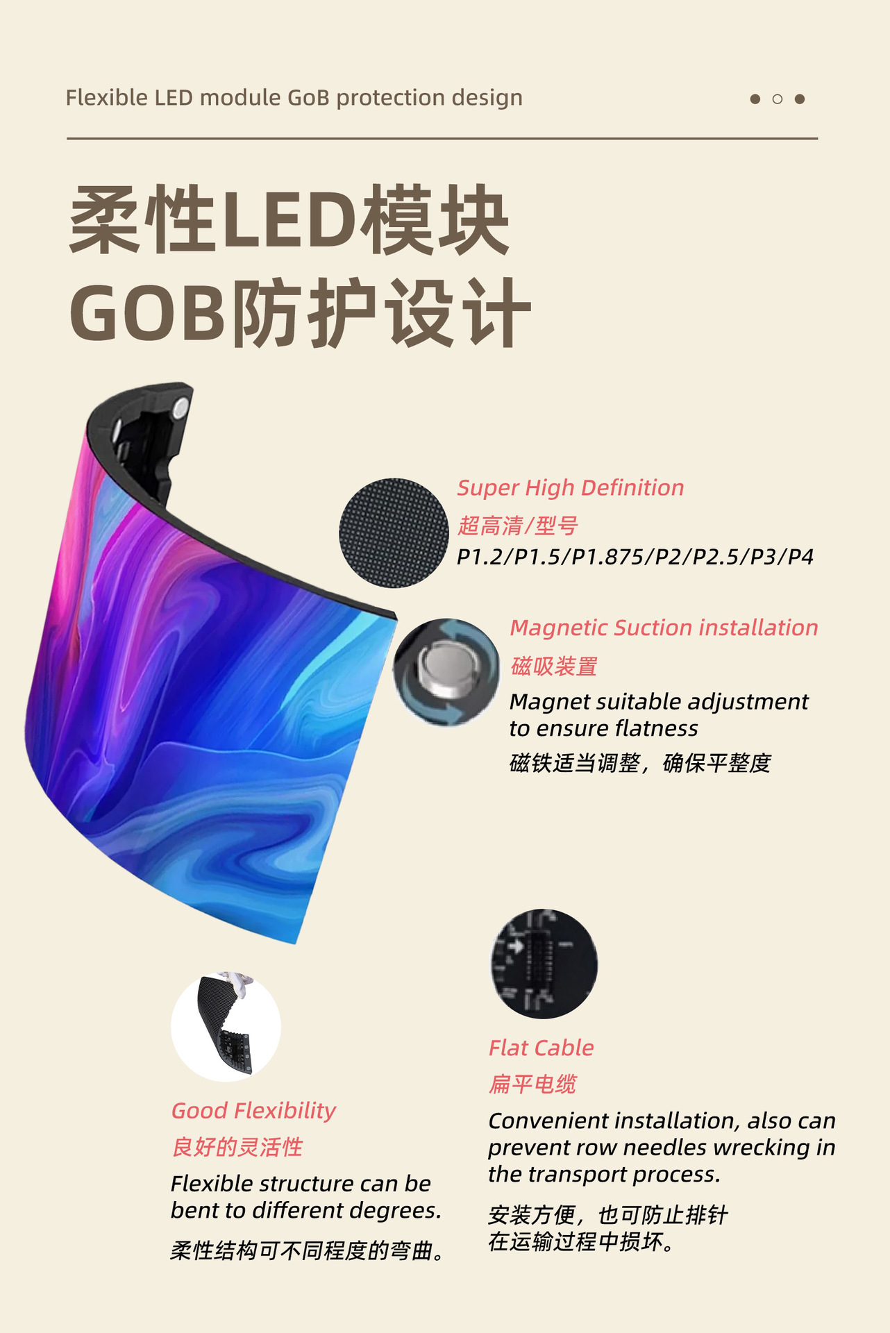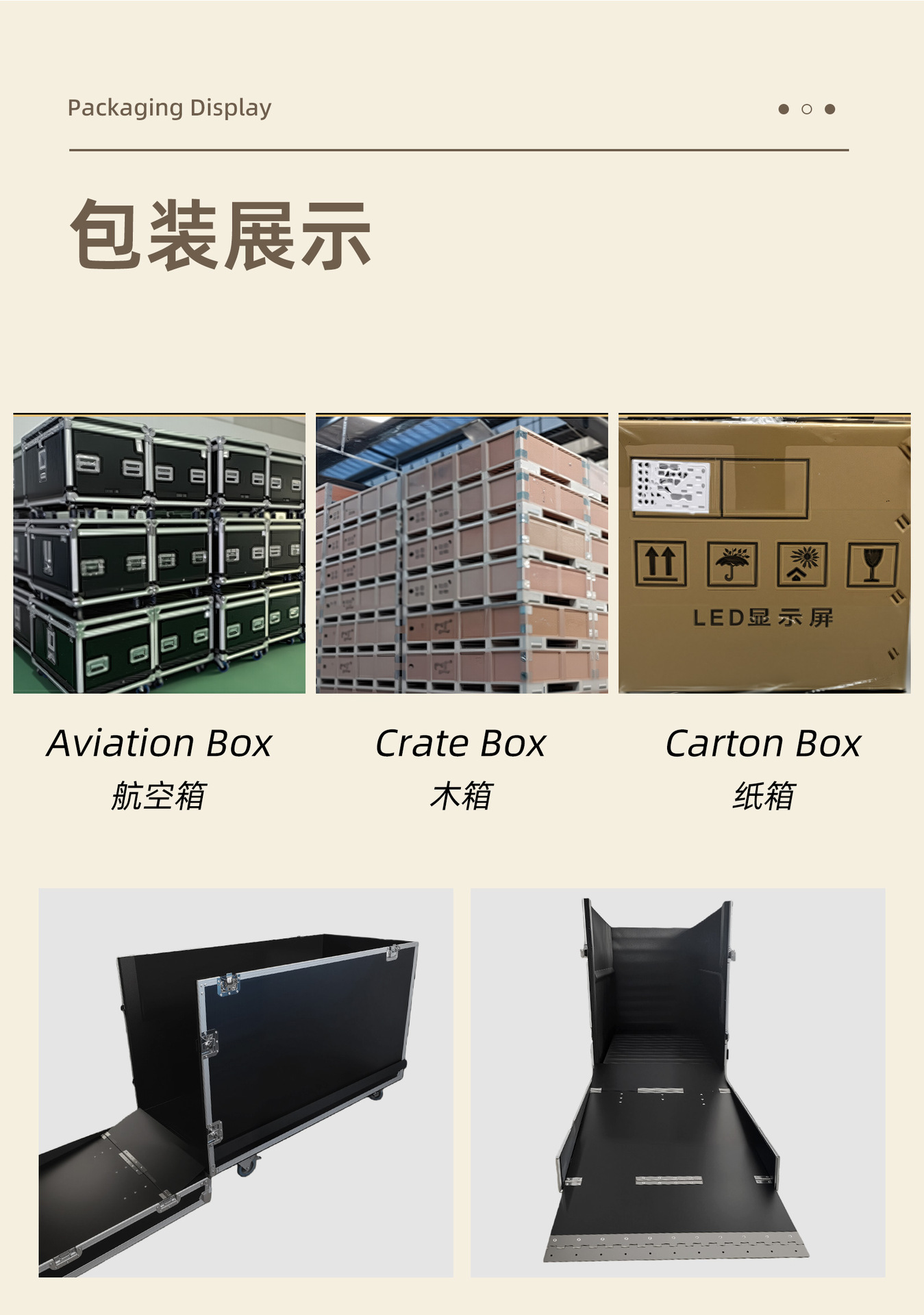EspecificacionesPantalla a todo color p1.86 (g0b), pantalla a todo color p2.0 (g0b), pantalla a todo color p2.5 (g0b), marco de pantalla de barra (personalizado), caja de Aviación