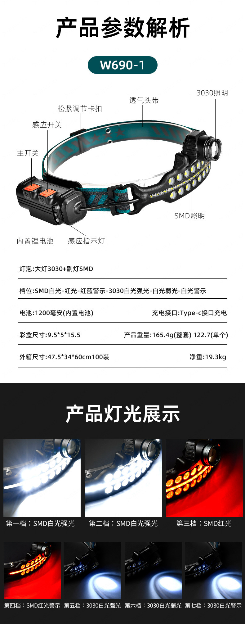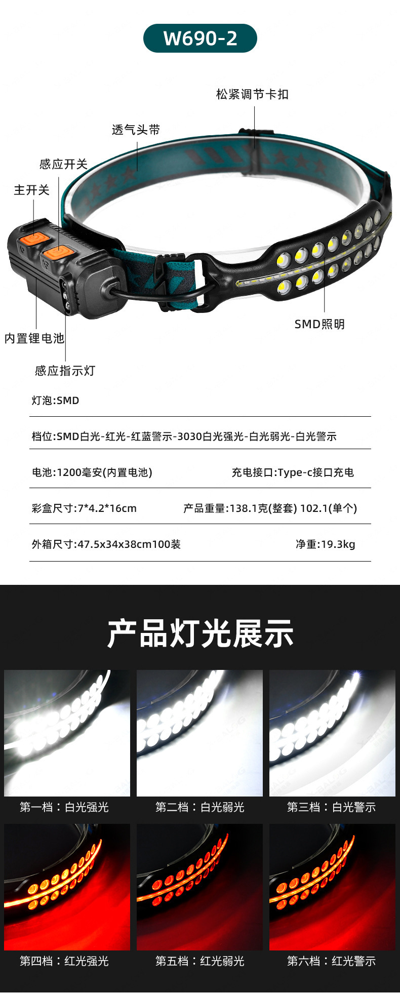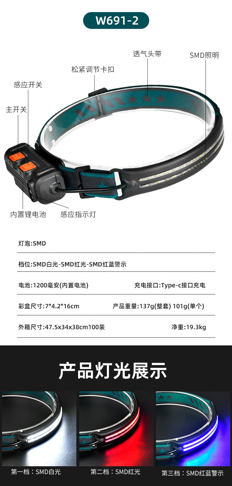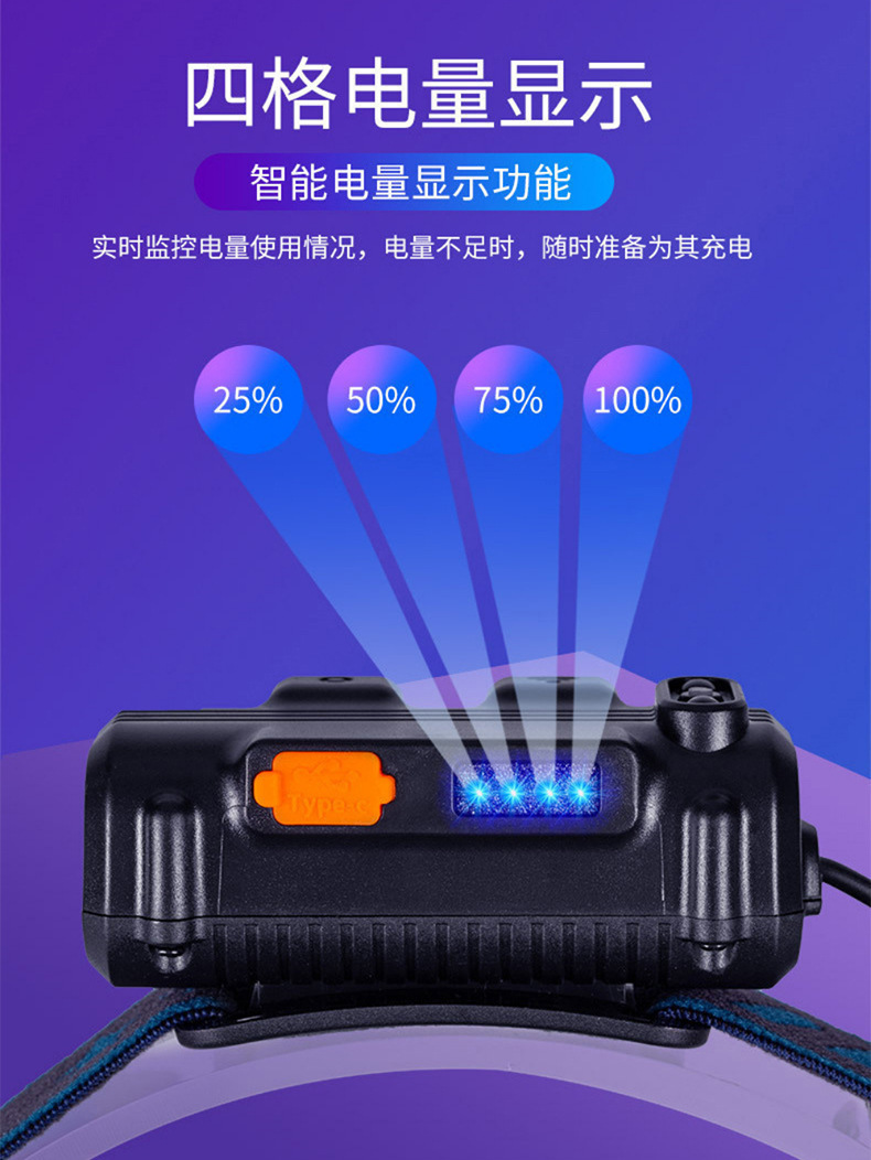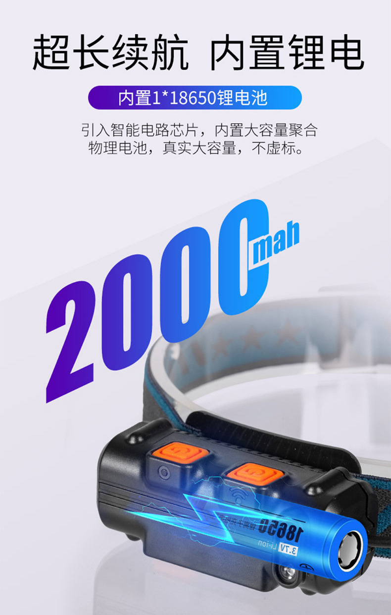 Cross-border nueva linterna montada en la cabeza luz de inducción de trabajo COB luz de cabeza calva fuerte luz de viaje al aire libre luz de pesca nocturna