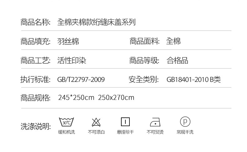 | Especificaciones de tamaño | Tapa de cama única 220x240cm (adecuada para camas de 1,5 metros), tapa de cama única 245x250cm (adecuada para camas de 1,8 metros), tapa de cama única 250x270cm (adecuada para camas de 2 metros), funda de almohada de algodón de botón 1 par (no se puede enviar con una sola foto), funda de almohada de algodón de borde ancho 1 par (no se puede enviar con una sola foto) |