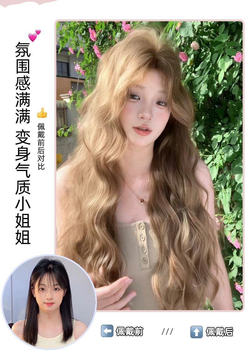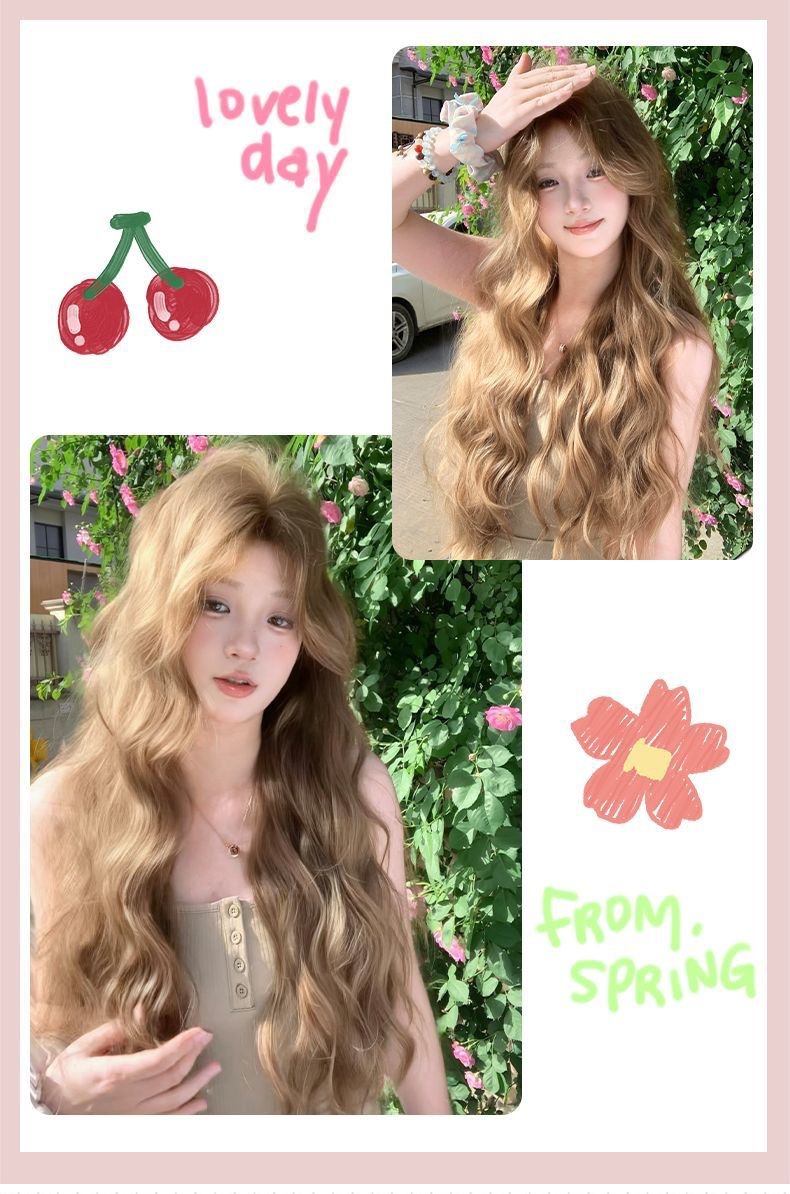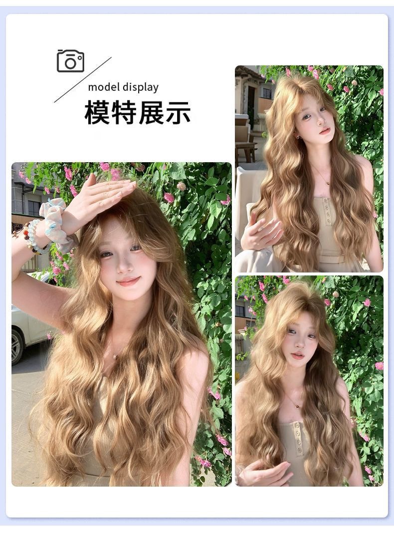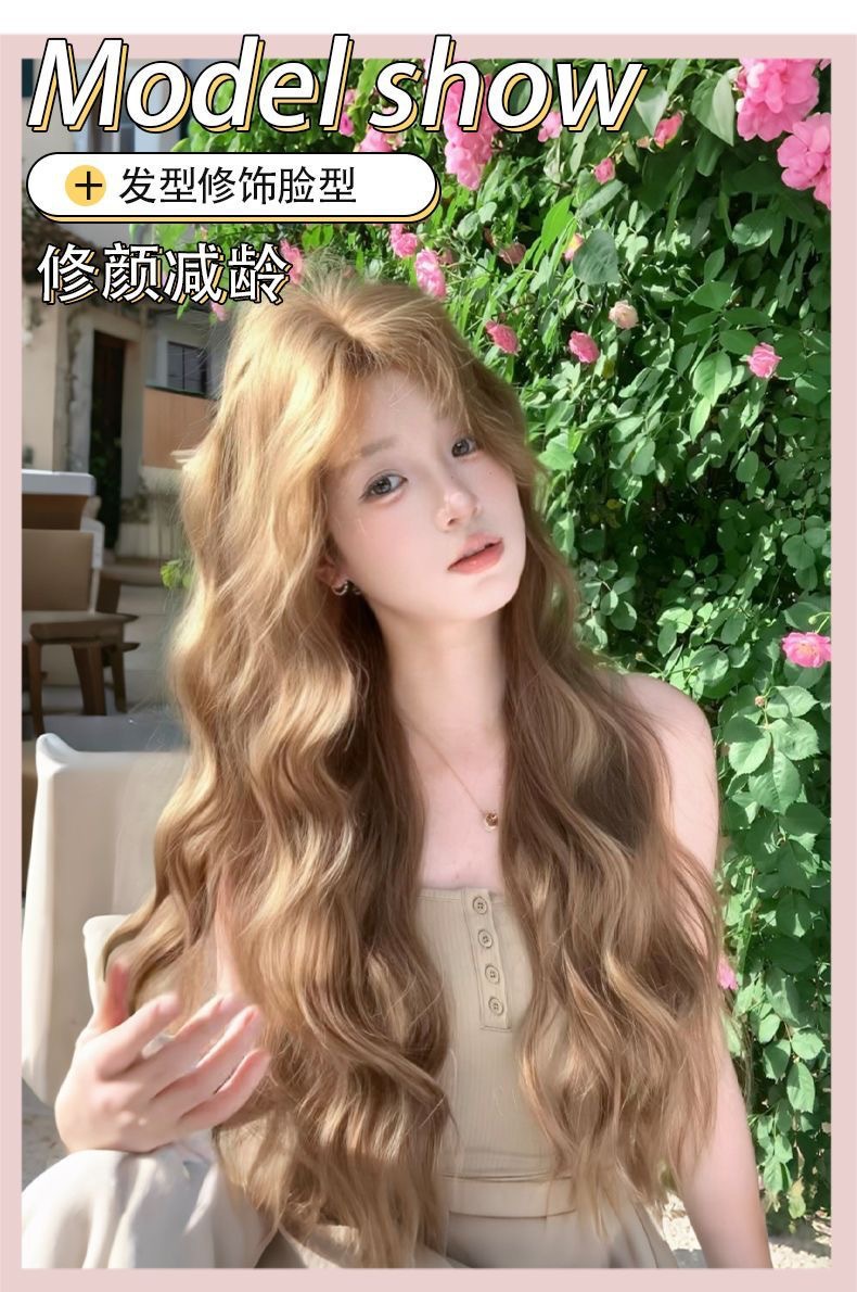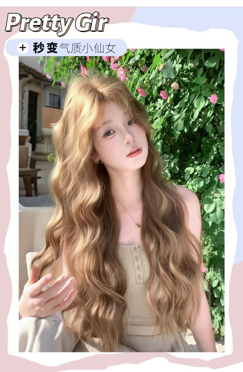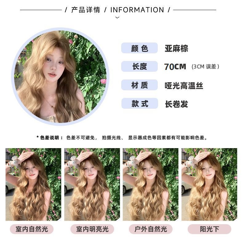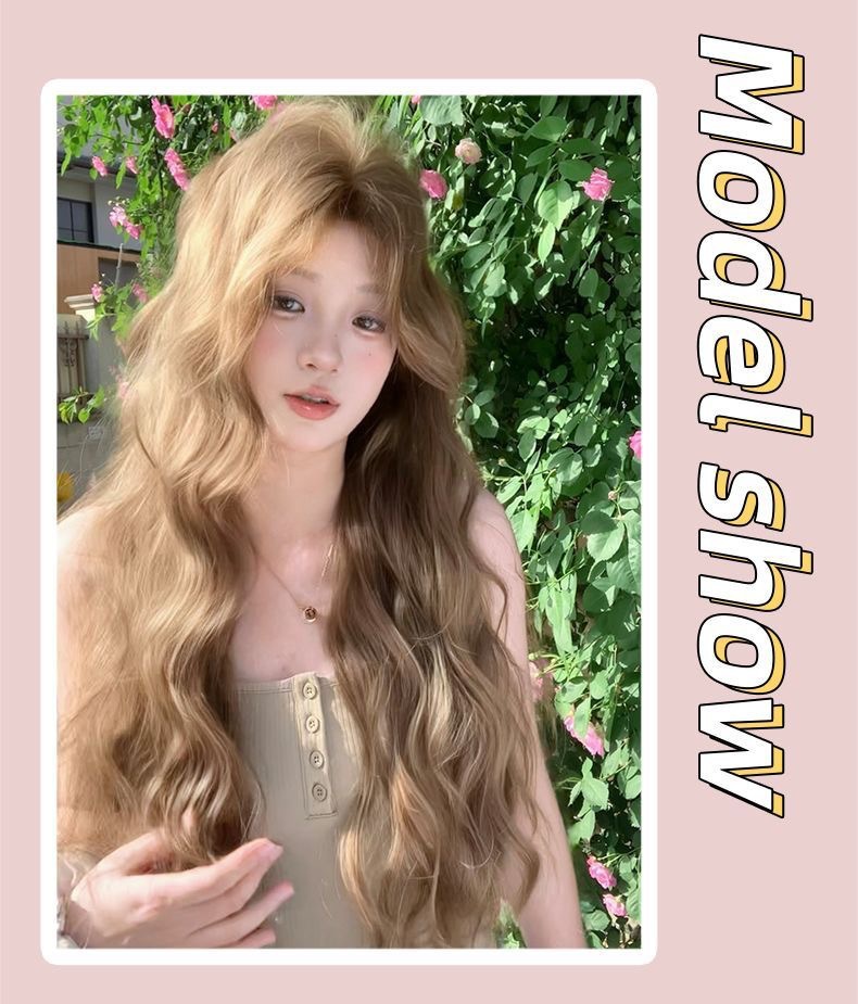 Nueva peluca lino marrón mediano perezoso sensación de cabello largo rizado lolita red cubierta de cabeza completa
