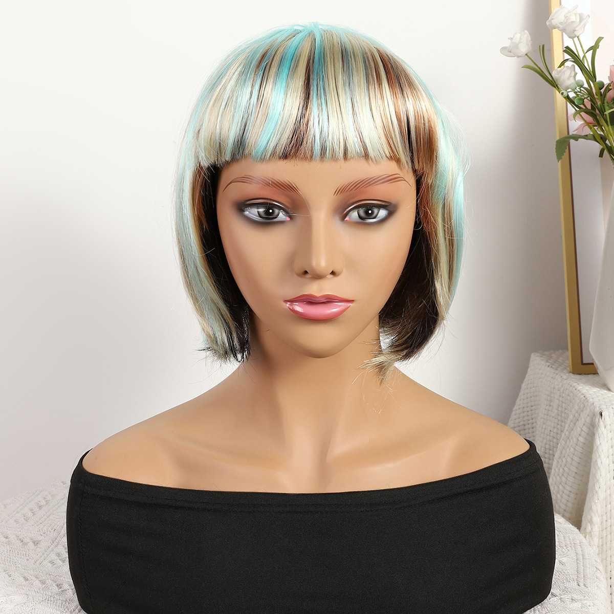 Transfronterizo nuevo azul mezcla de color gradiente largo 12 pulgadas sin encaje pelo recto europeo y brasileño peluca