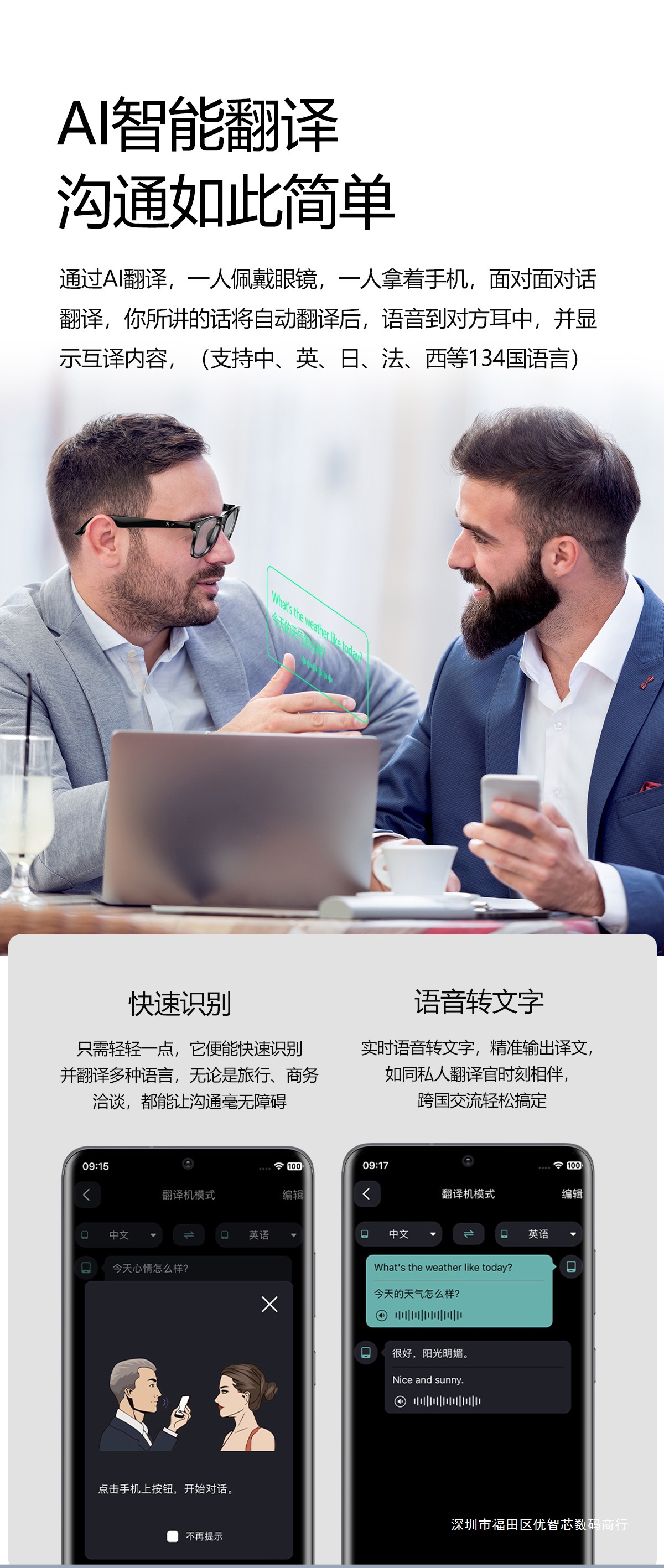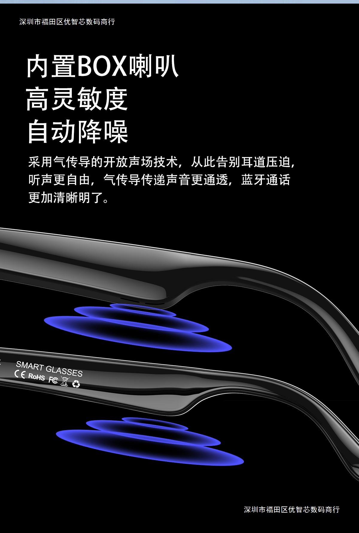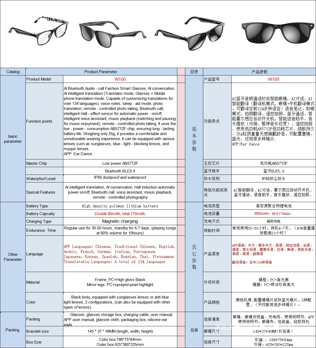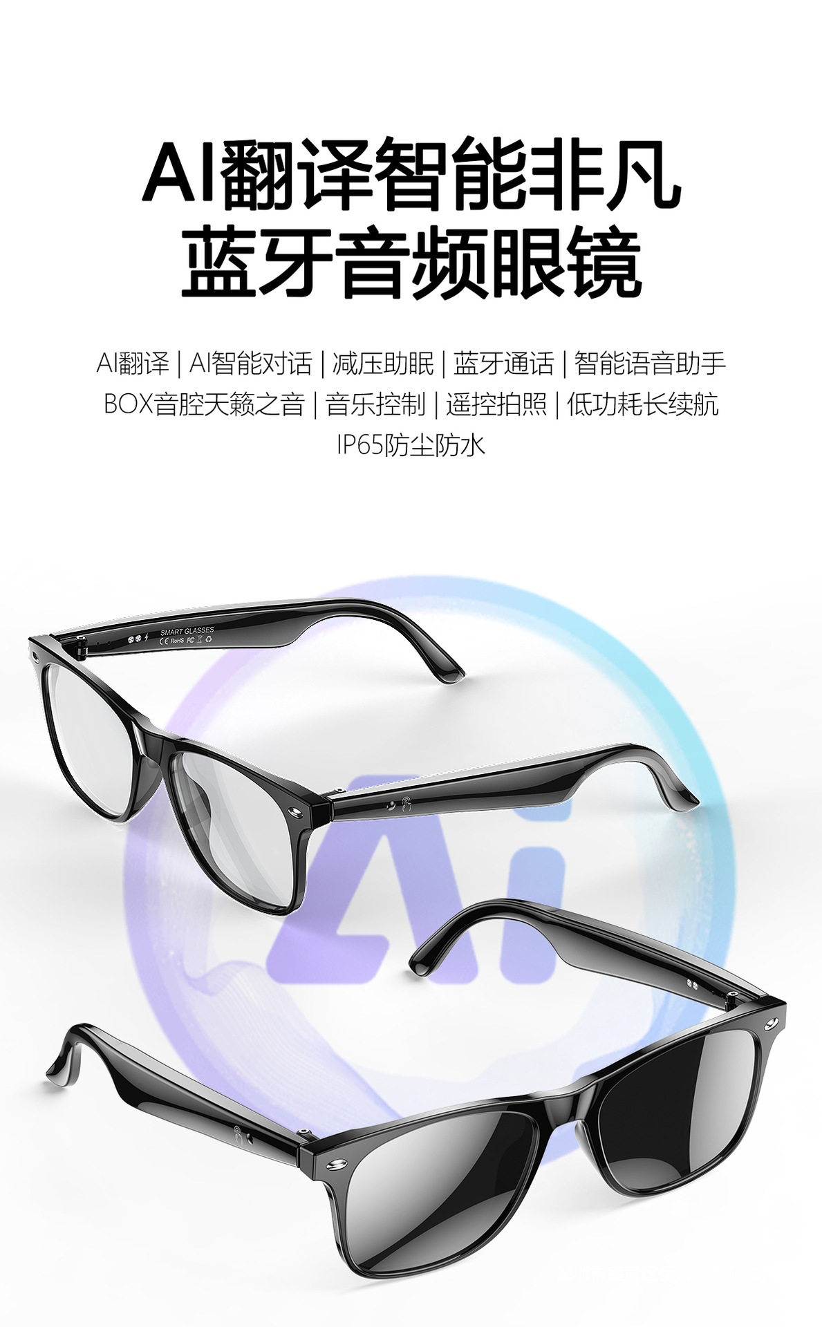 W100 Smart AI Translation Bluetooth Call Moda Deportes Oficina Negocios Reproducción de música Gafas inteligentes