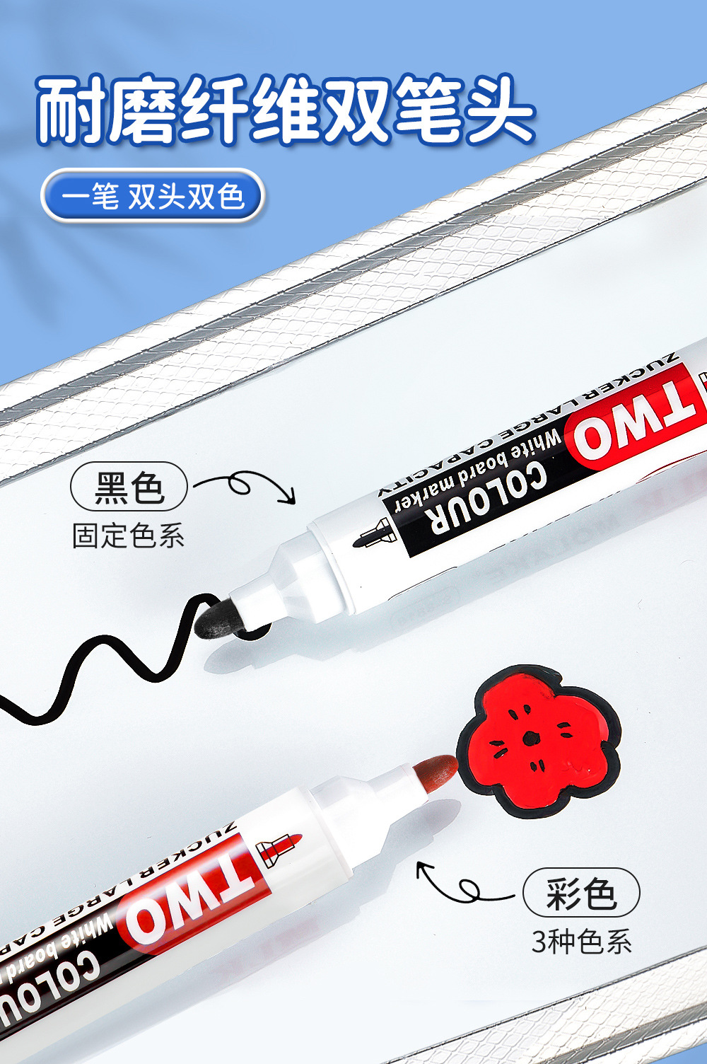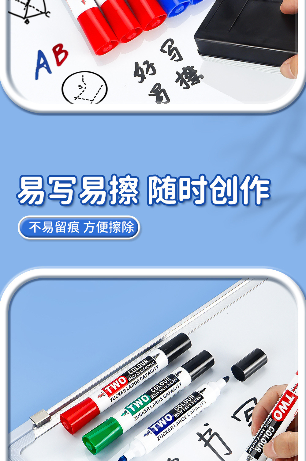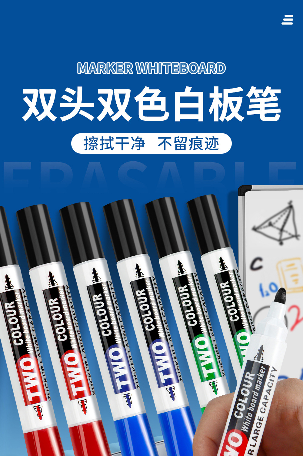Transfronterizos de dos cabezas de dos colores bolígrafo de pizarra de enseñanza de escritura suave cinta de tinta continua pizarra limpieza al por mayor spot